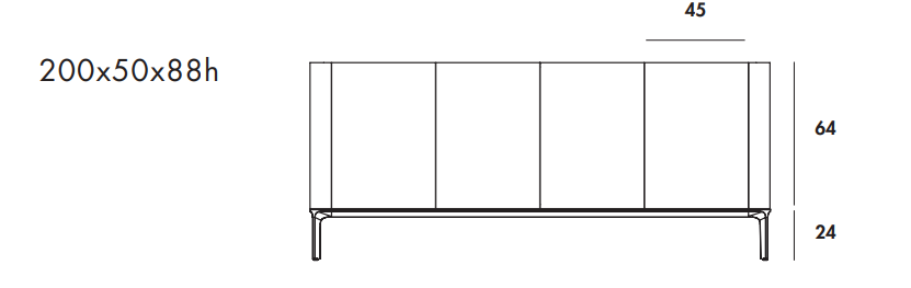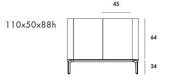 Madia con struttura e gambe in alluminio, varie finiture. Moduli in mdf impiallacciato Noce Canaletto o rovere tinto wengé. Piano disponibile in vari materiali e finiture. Ripiano centrale in vetro fumé regolabile in altezza.