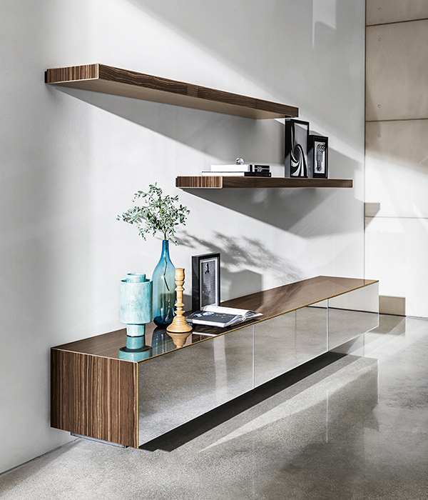 Sistema di mensole personalizzabili con anima strutturale in acciaio. Rivestimento in ceramica, varie finiture. Disponibile nelle versioni con o senza led.