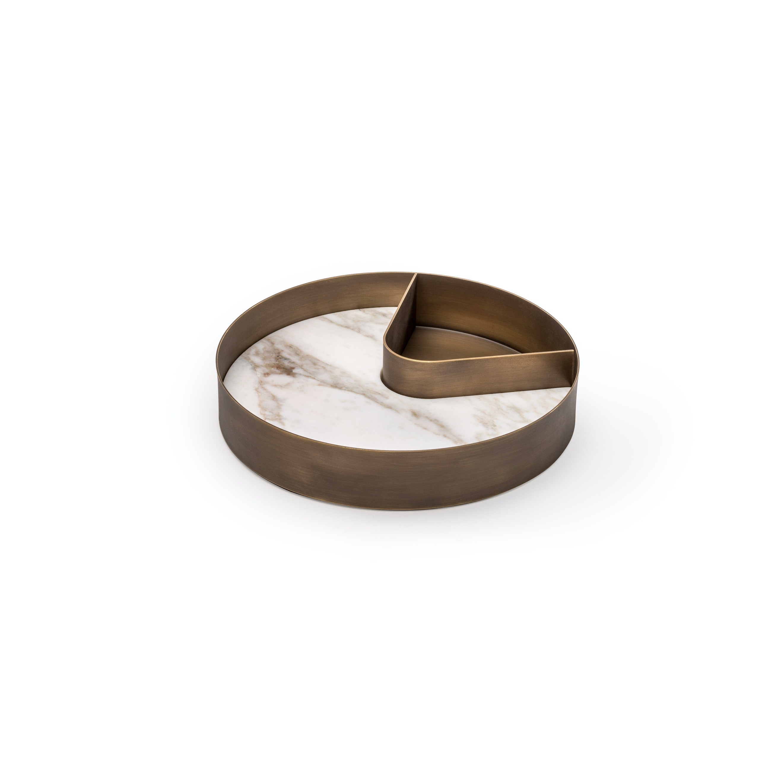 The Balancing tray is made from burnished brass, lined with a circular slab of Calacatta Vagli marble with a ‘slice’ cut out to create two distinct spaces, perfect for separating items and keeping your desk in order.