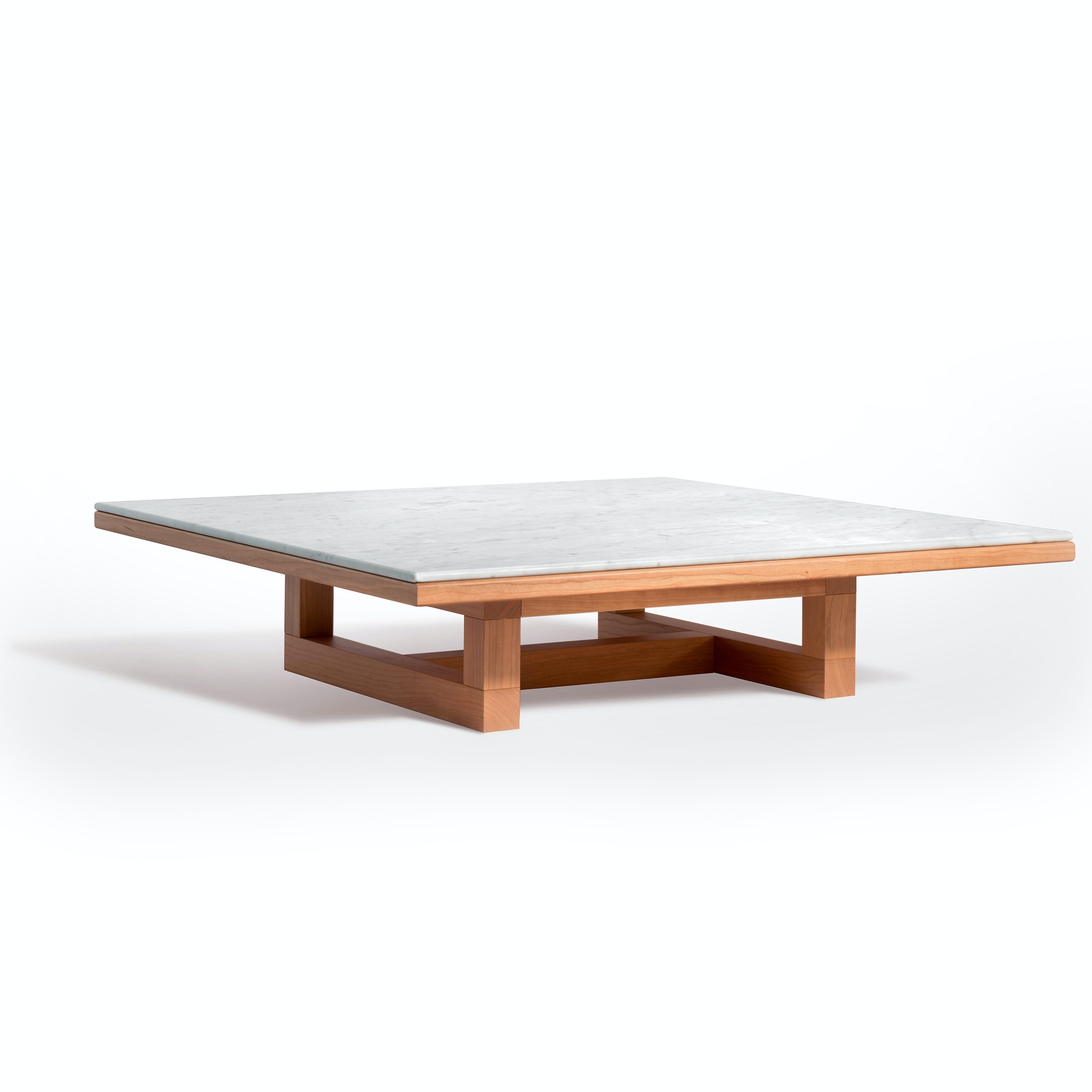 The coffee table pairs a square Bianco Carrara marble tabletop and a low-slung cherry wood structure and features careful details such as rounded edges and a simple but thoughtfully devised frame.