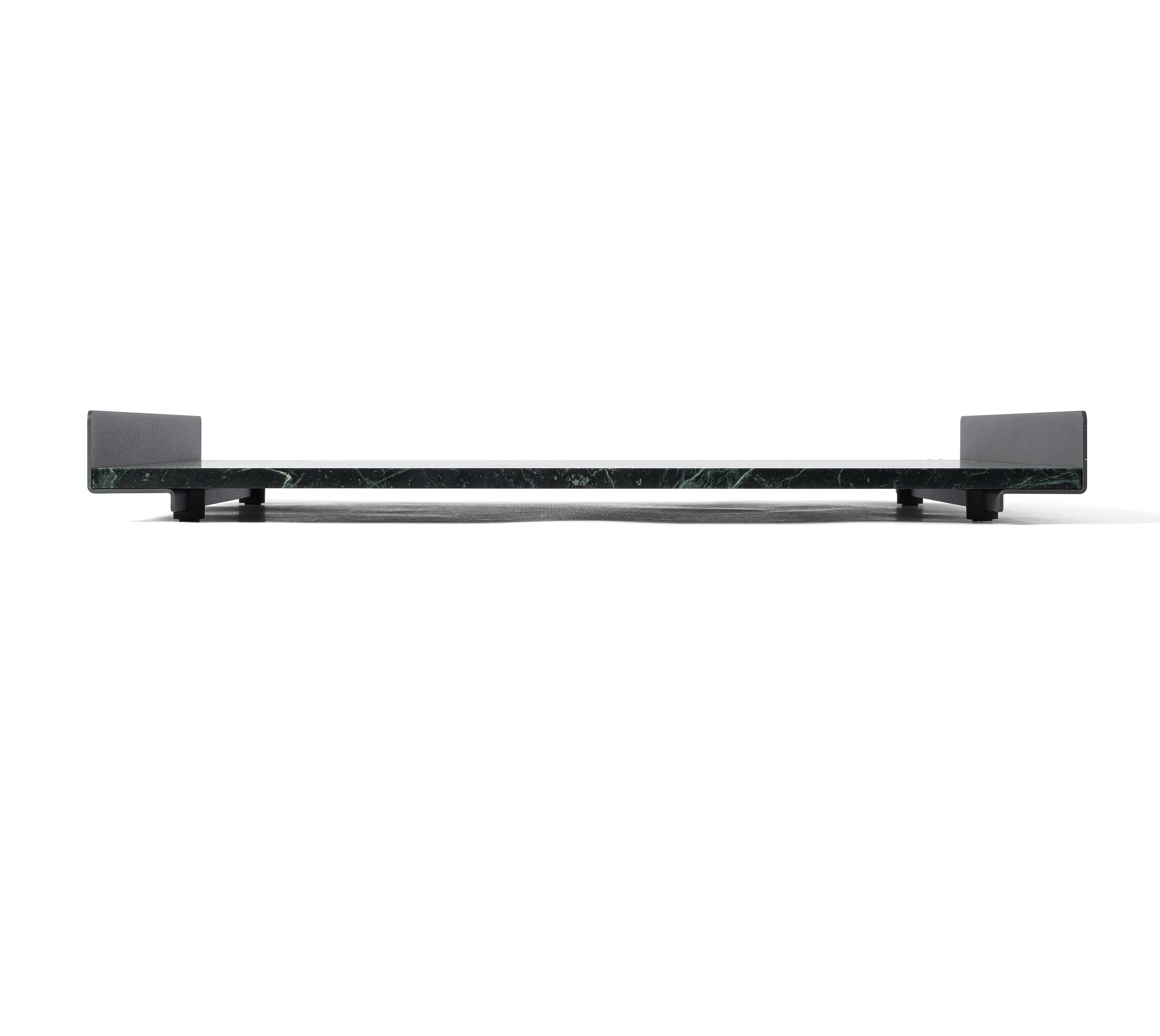 The L Collection 03 trays are square or rectangular slabs of marble flanked by a bracket of dark iron.