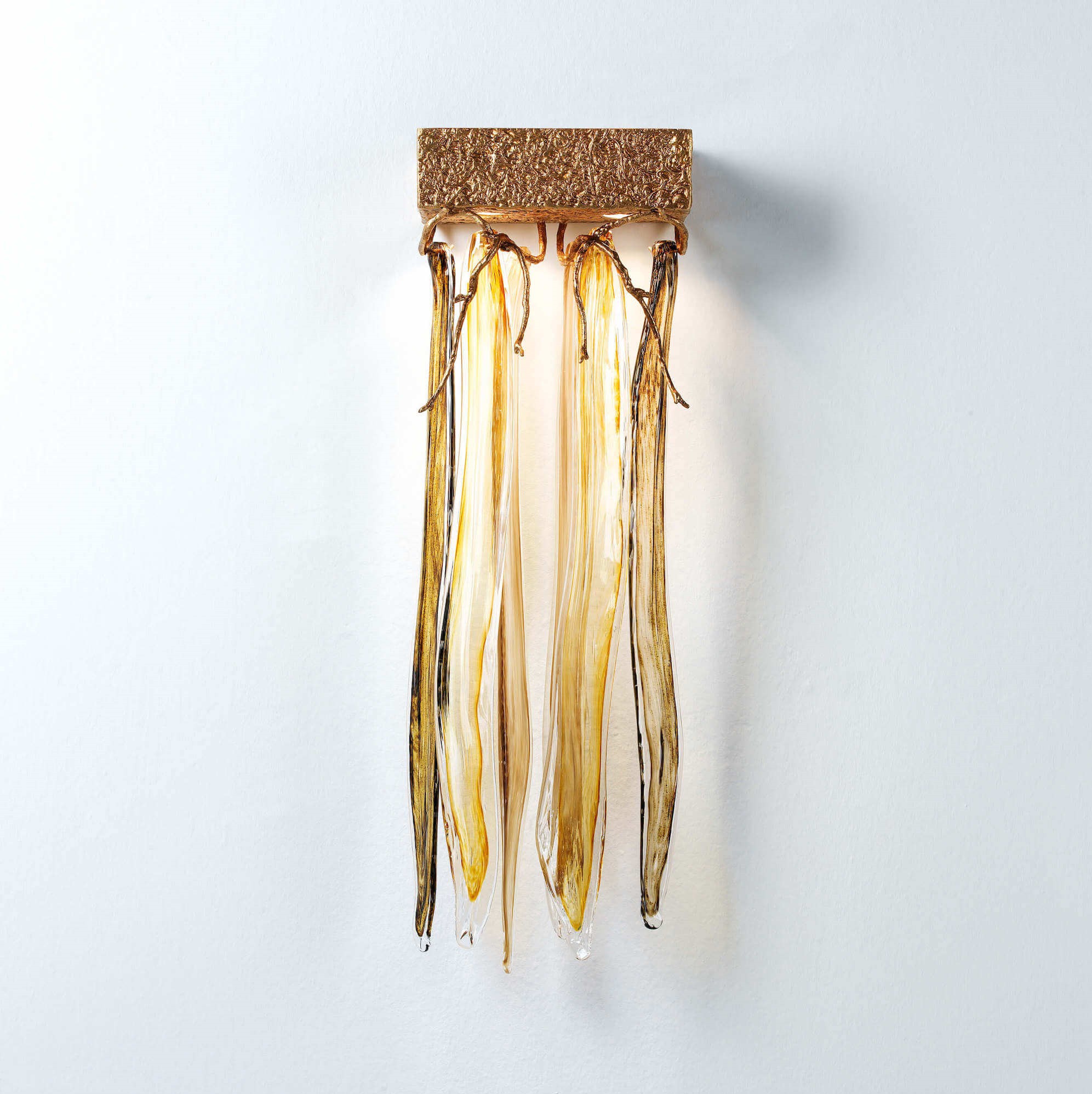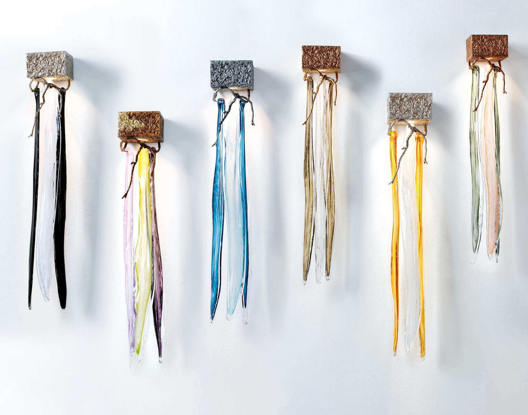Featuring intrinsic solid verticality, the Waterfall collection plays with the duality of visually dense crystal pieces and the minimalism of the bronze structure. Impending water fractions suspended and immobilized, the glass of the Waterfall exist in an extended diversity of chromatic options, a characteristic that combined with the different bronze finishes, meets the need to combine with decoration elements of various shades in a grandiose visual presence.