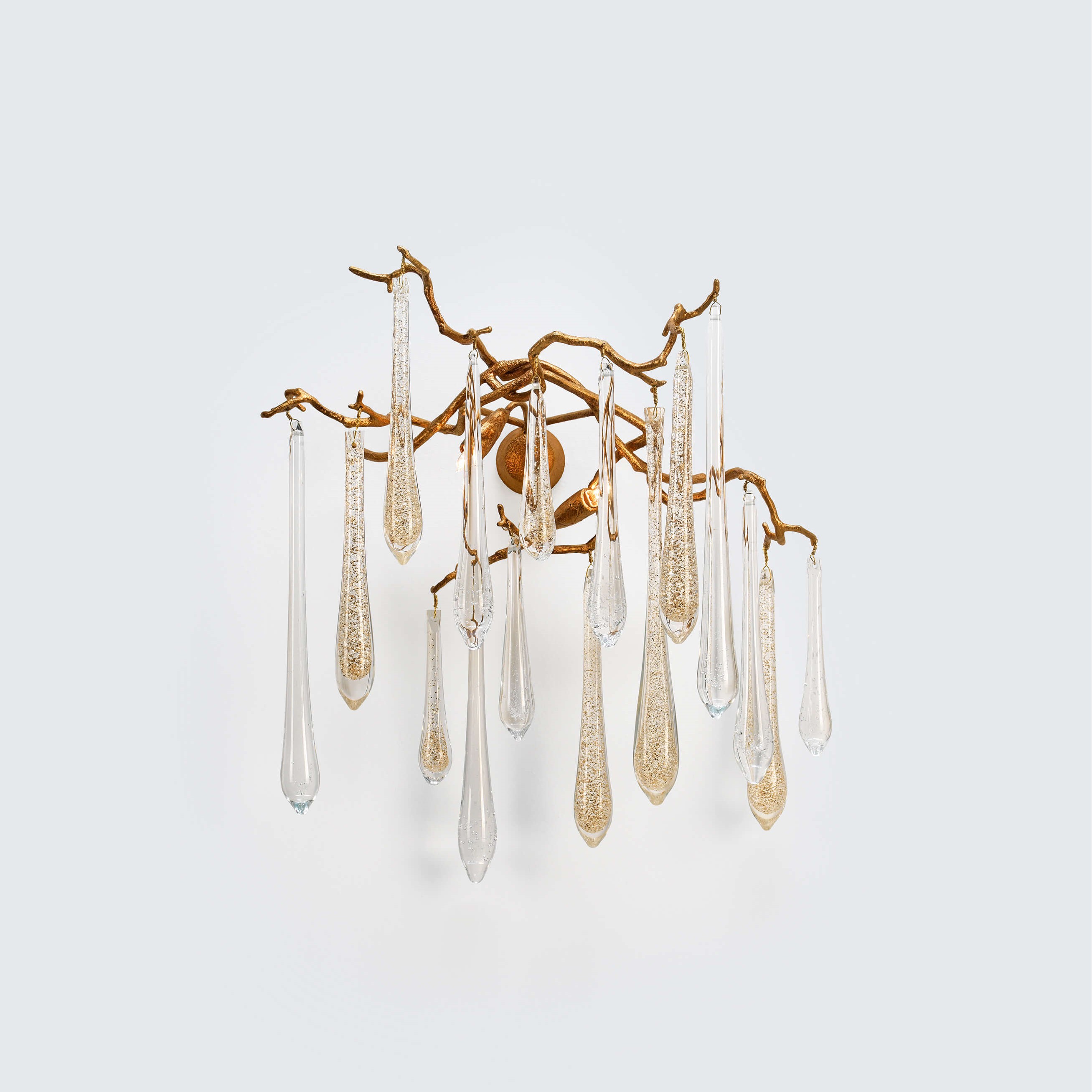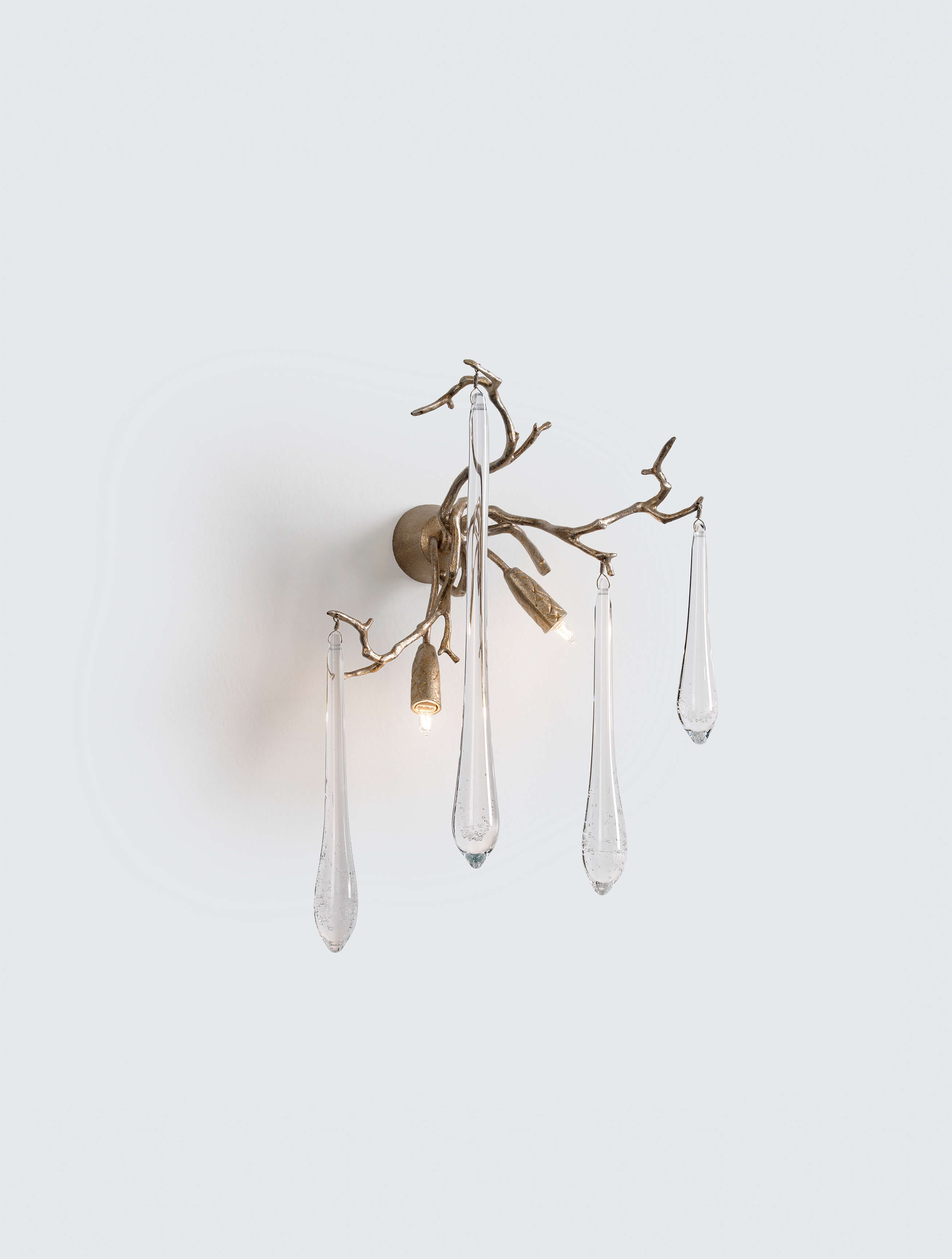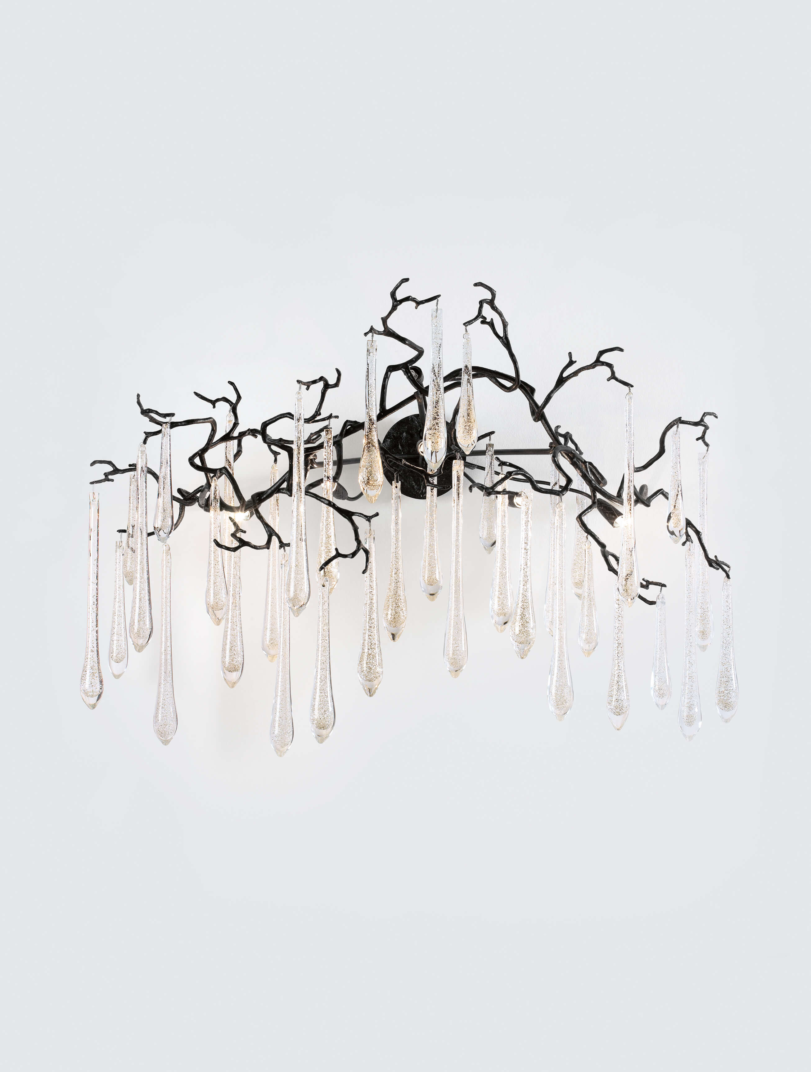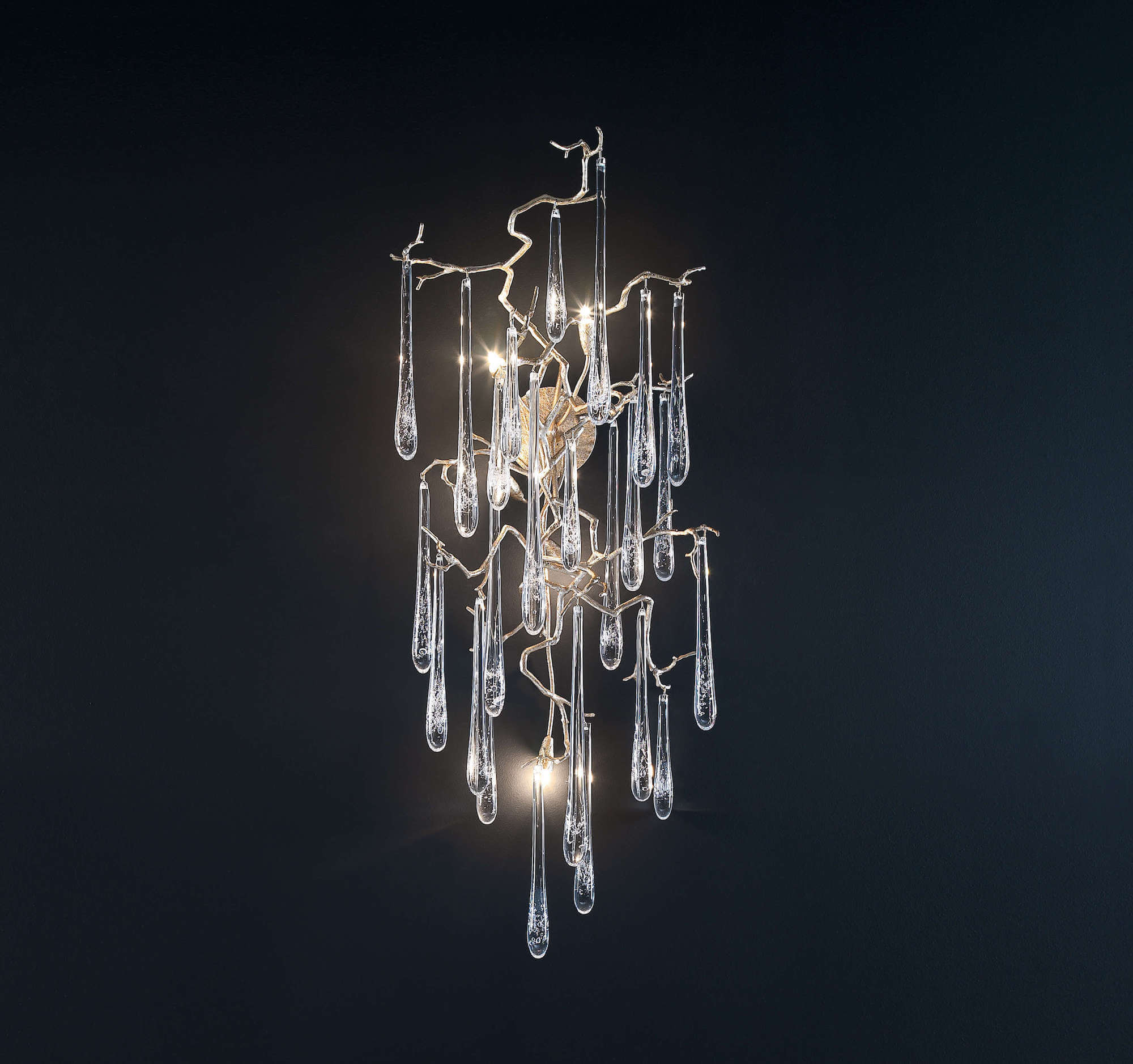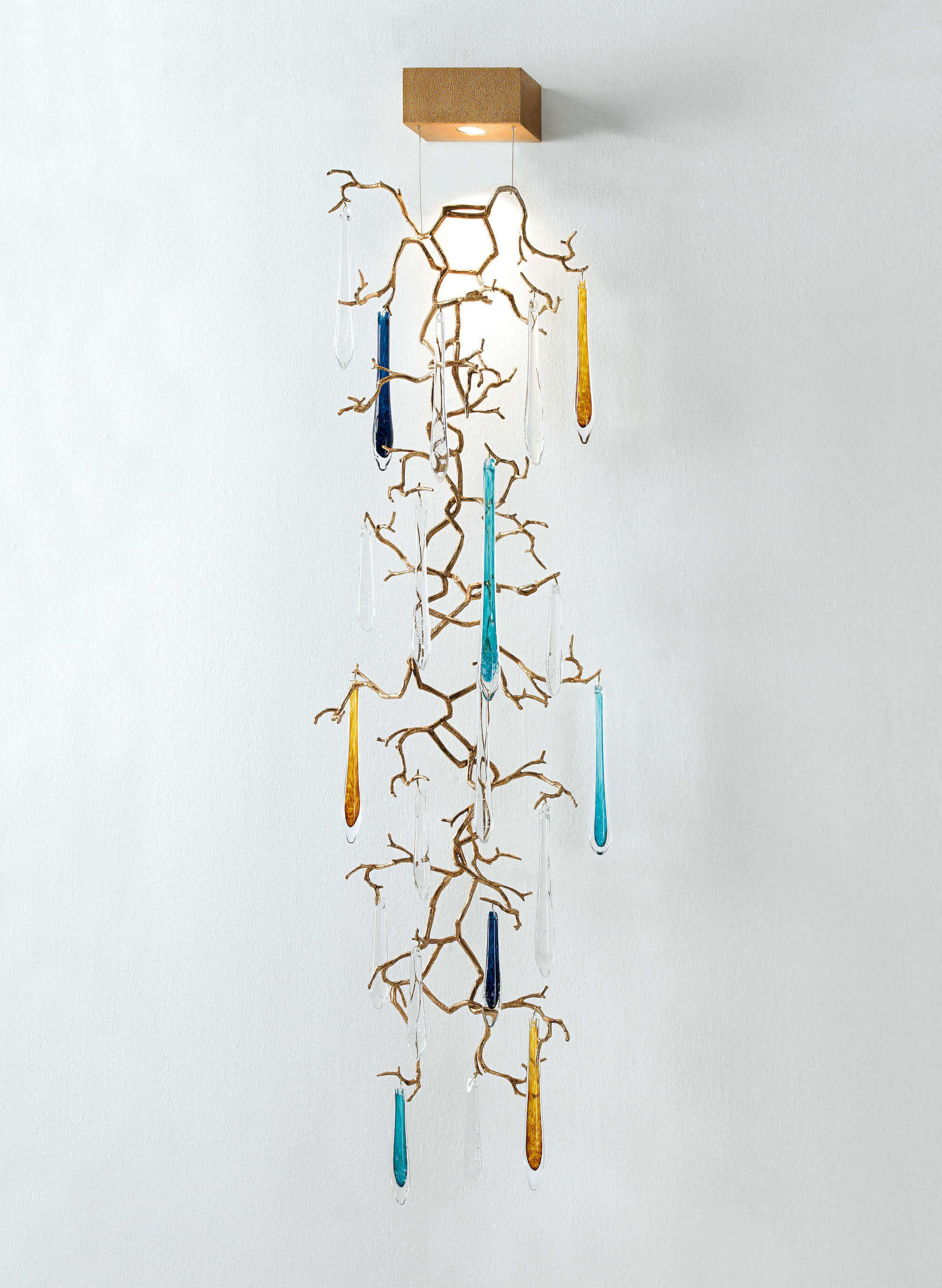 The Aqua Collection is an iconic set of the Serip family, both by its element of inspiration and by its inherent association with our identity, expressing a strong connection to our main inspiration source, nature. The bronze structure expands in entangled branches that lead to floating glass pieces, a characteristic that concedes an airy touch together with its delicate and elegant look, concepts visible in the smallest detail of the glass drops. Through several chromatic choices and design options, the Aqua Collection presents itself as an exquisite nature-inspired piece, perfect for any concept.