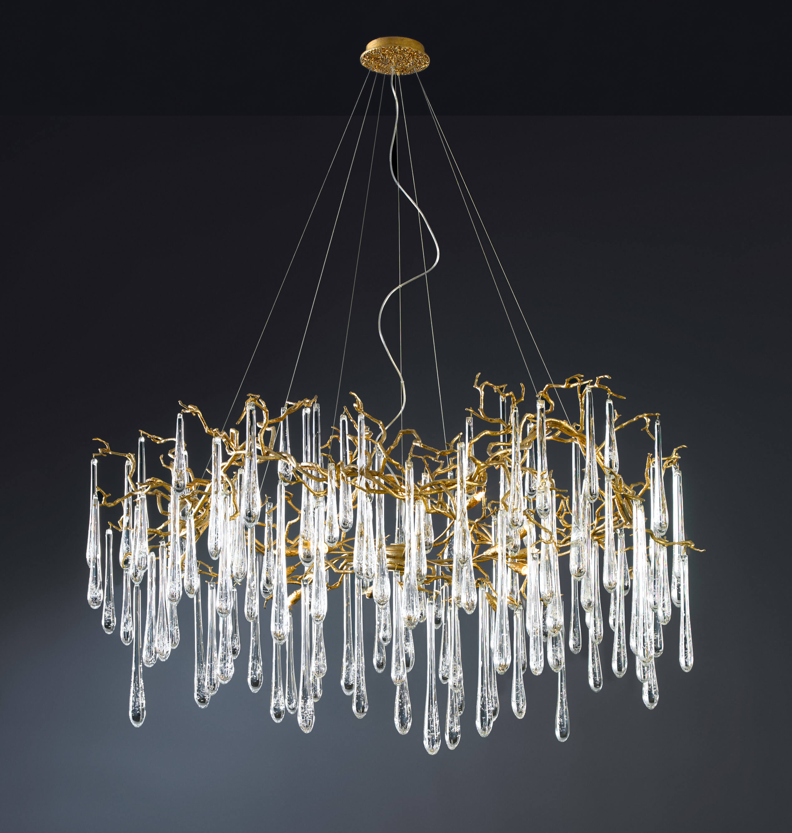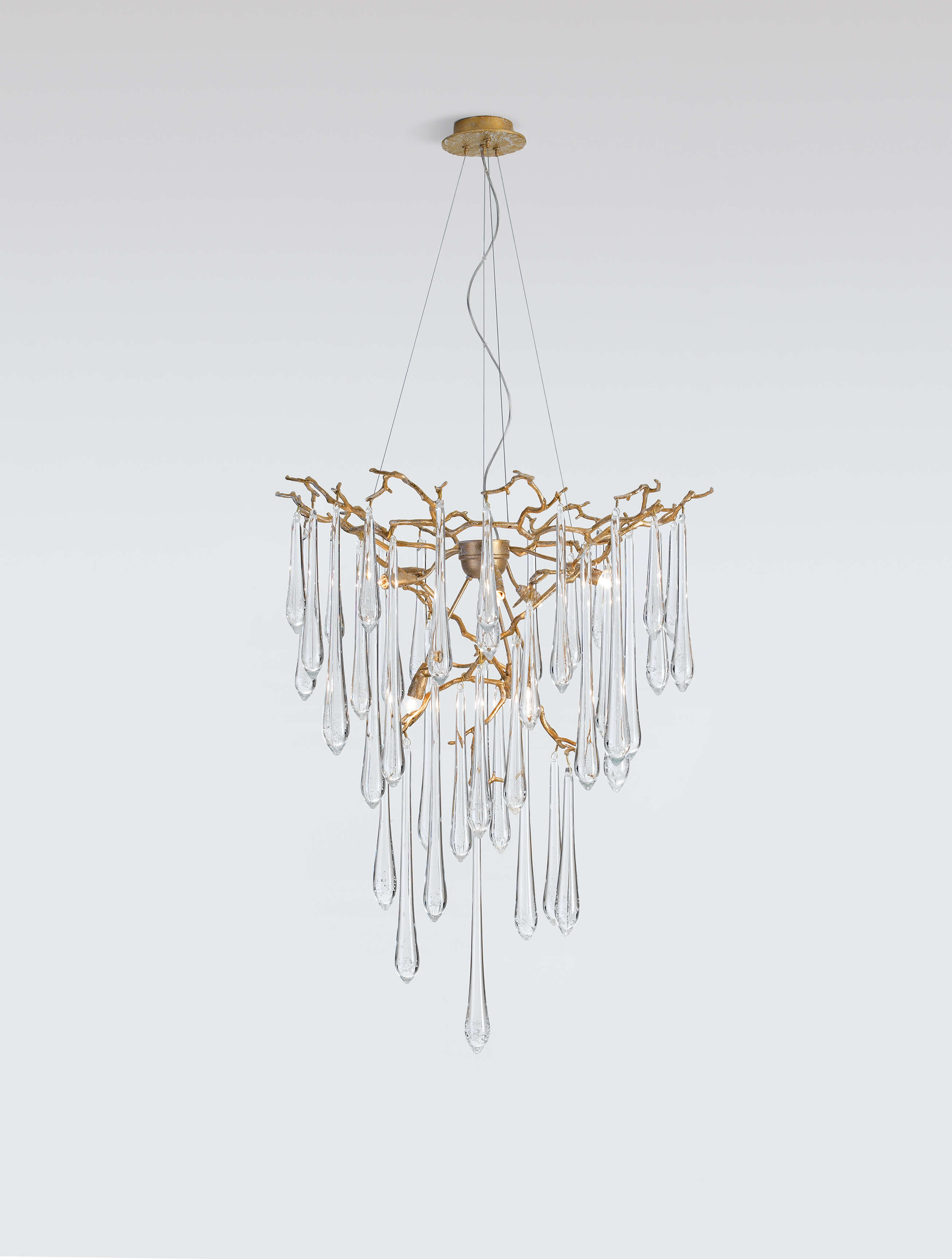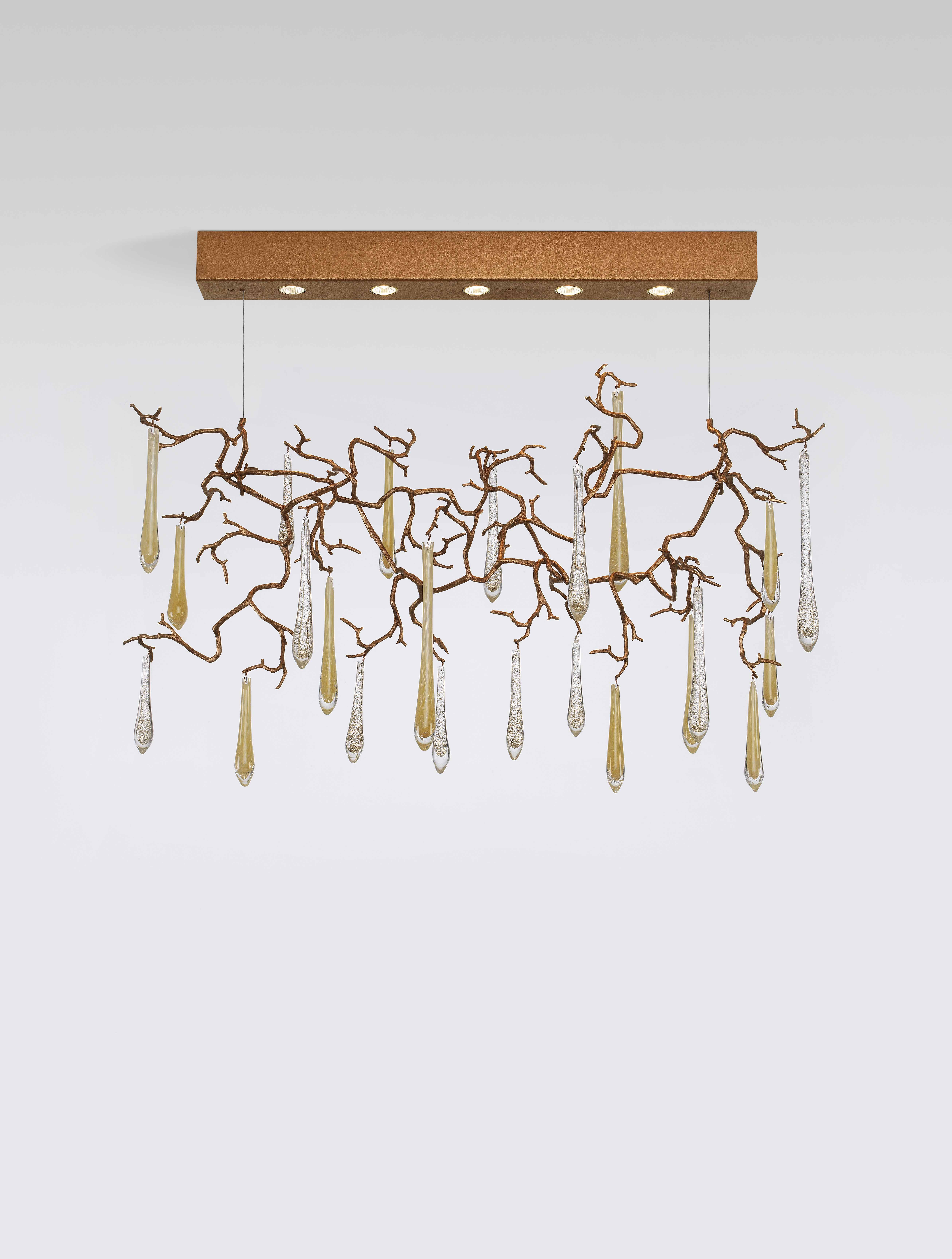 The Aqua Collection is an iconic set of the Serip family, both by its element of inspiration and by its inherent association with our identity, expressing a strong connection to our main inspiration source, nature. The bronze structure expands in entangled branches that lead to floating glass pieces, a characteristic that concedes an airy touch together with its delicate and elegant look, concepts visible in the smallest detail of the glass drops. Through several chromatic choices and design options, the Aqua Collection presents itself as an exquisite nature-inspired piece, perfect for any concept.