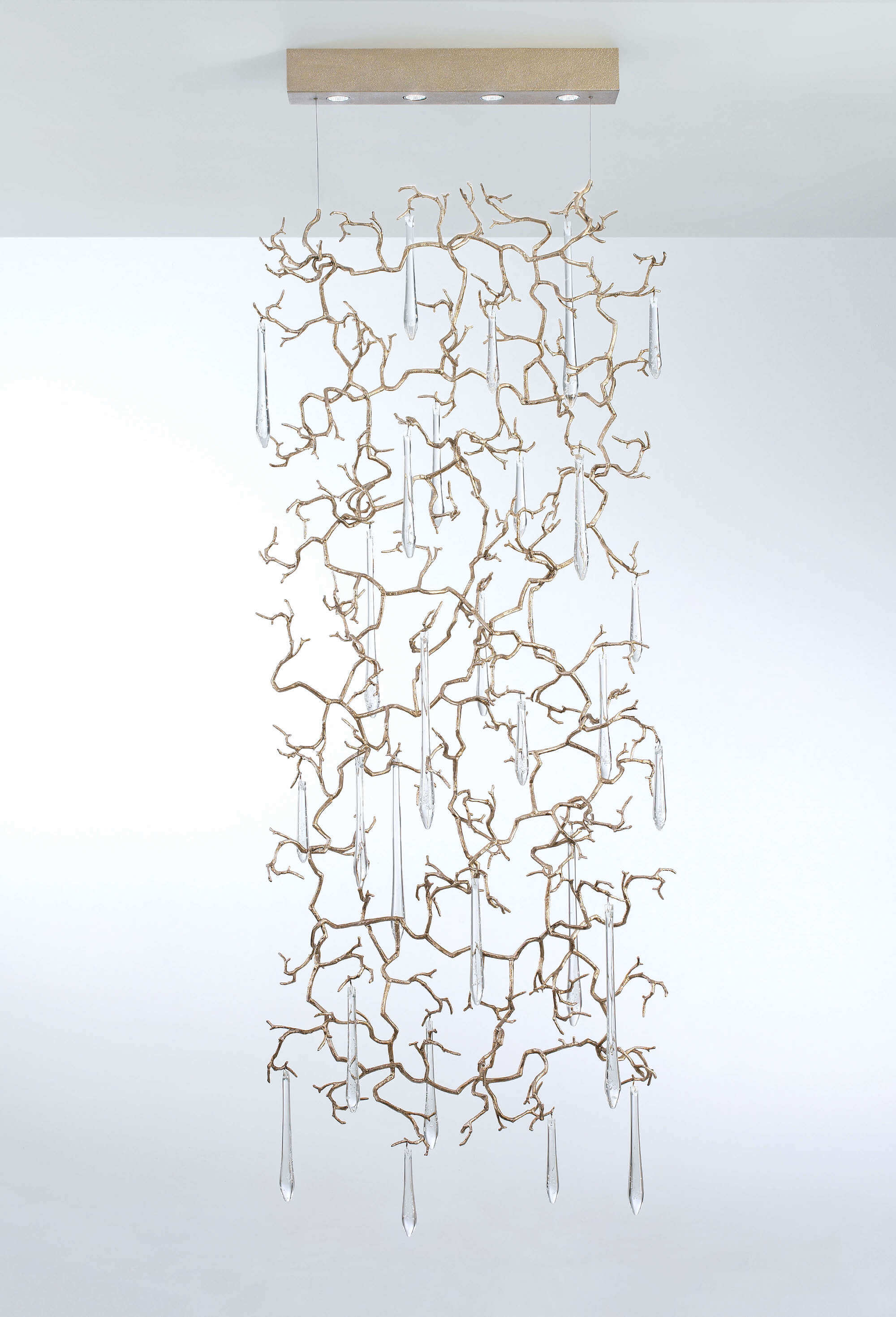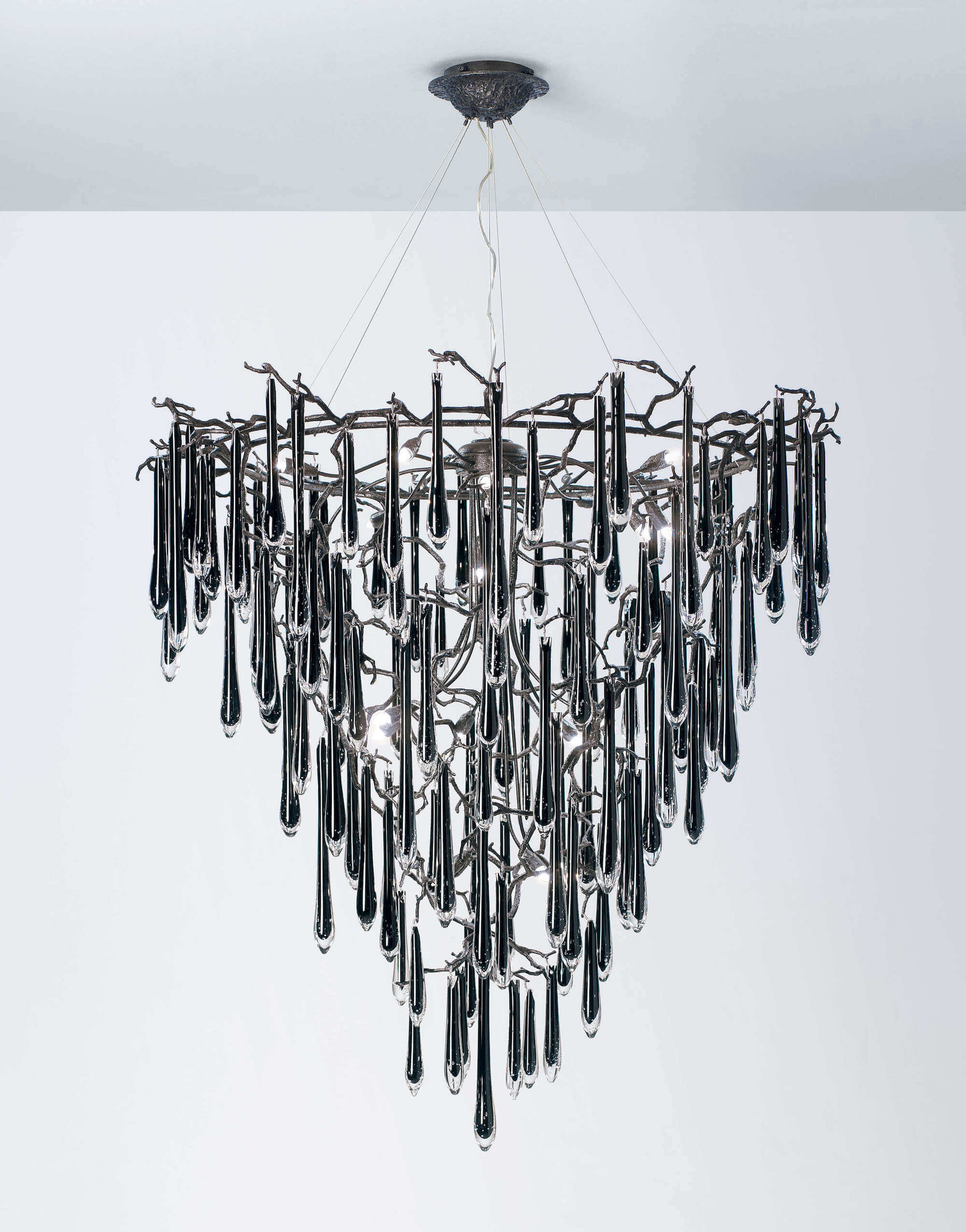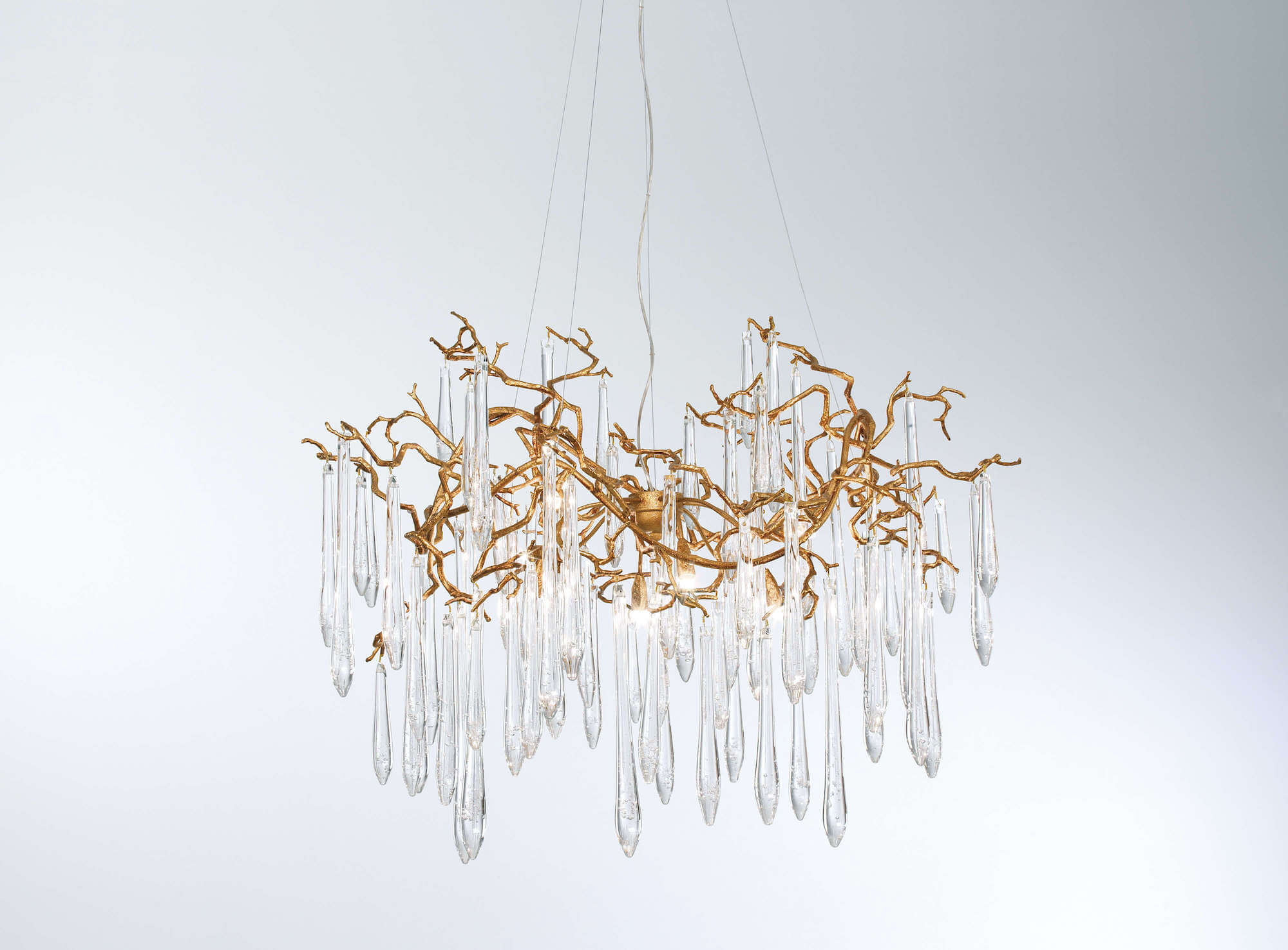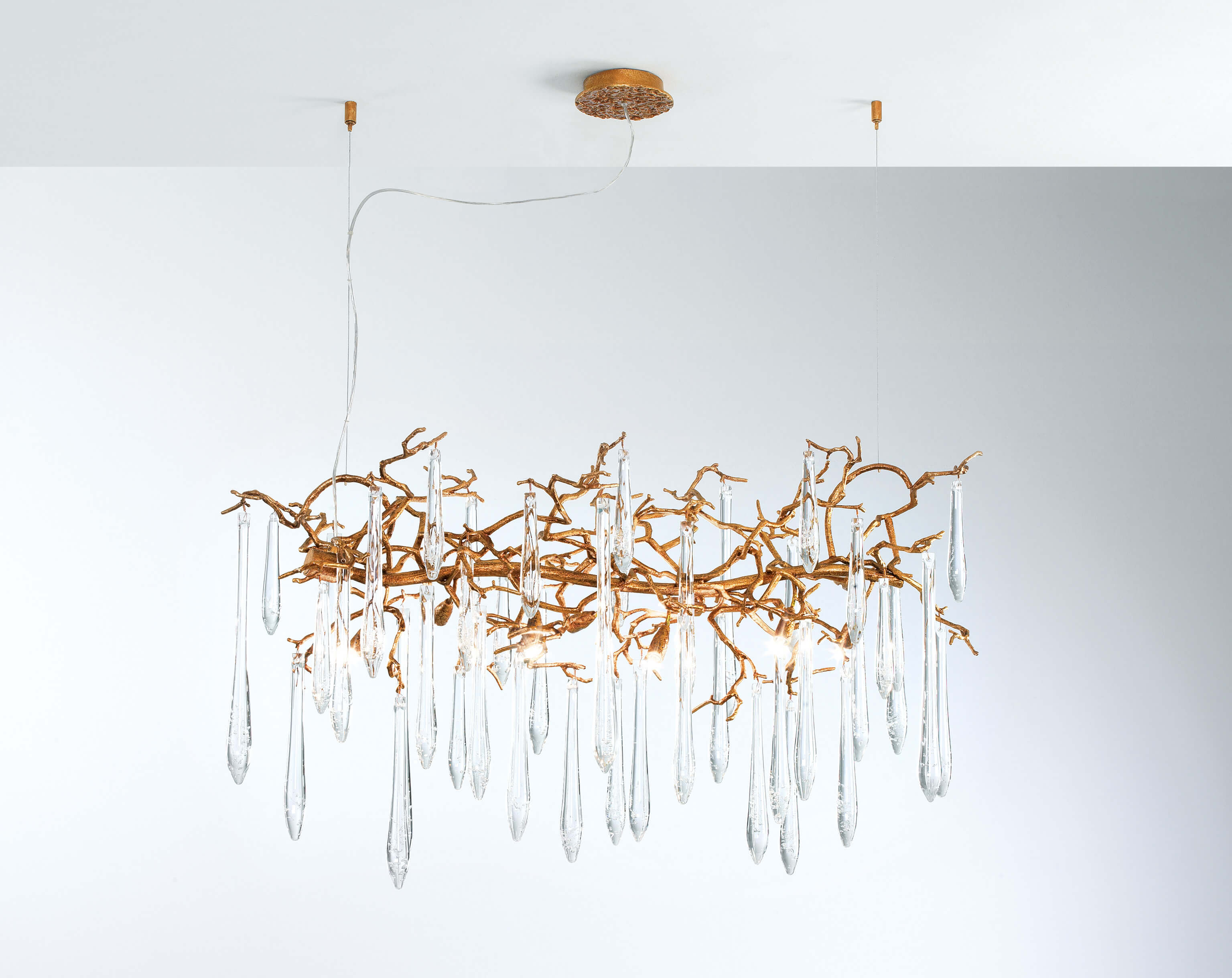 The Aqua Collection is an iconic set of the Serip family, both by its element of inspiration and by its inherent association with our identity, expressing a strong connection to our main inspiration source, nature. The bronze structure expands in entangled branches that lead to floating glass pieces, a characteristic that concedes an airy touch together with its delicate and elegant look, concepts visible in the smallest detail of the glass drops. Through several chromatic choices and design options, the Aqua Collection presents itself as an exquisite nature-inspired piece, perfect for any concept.