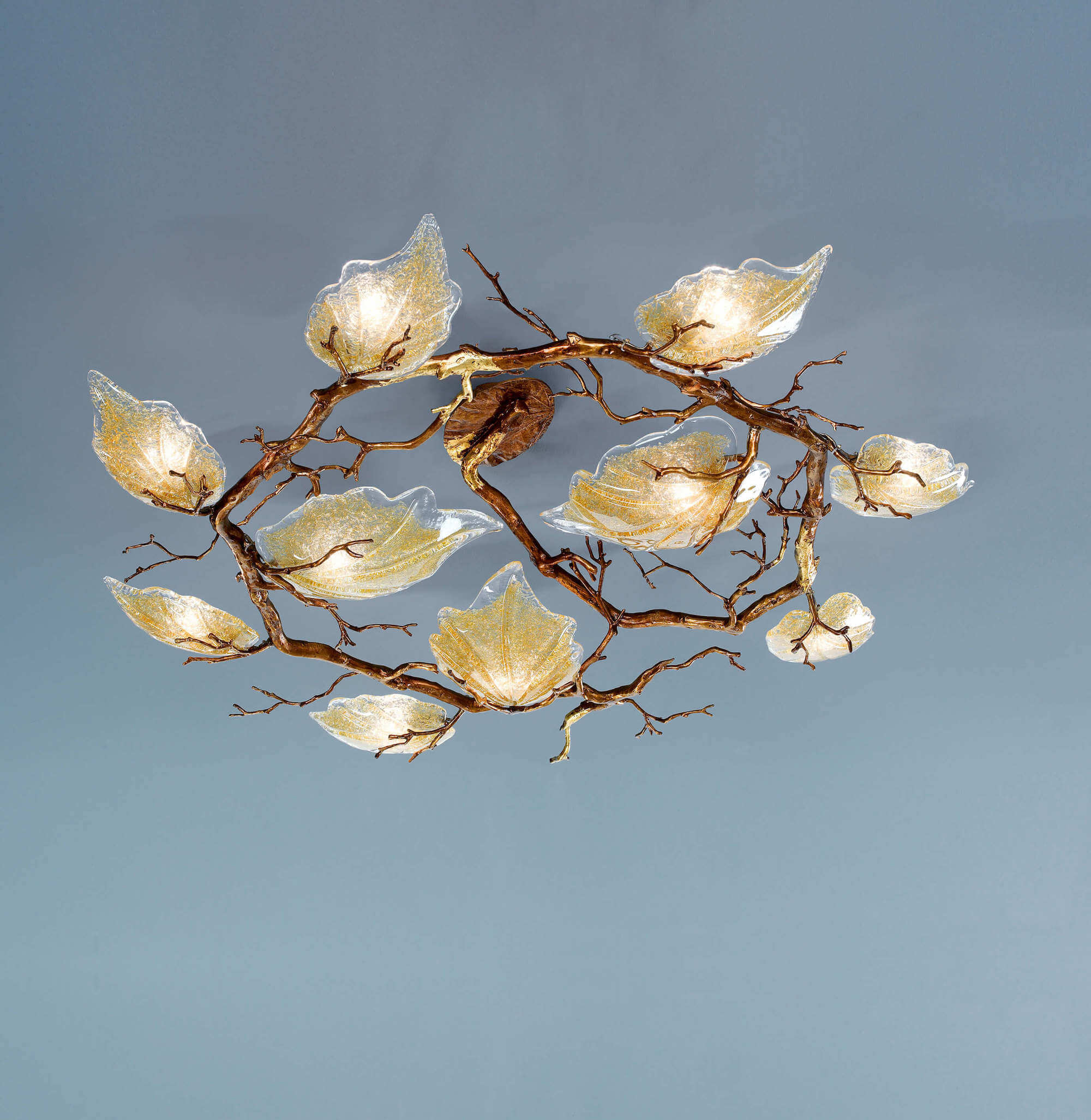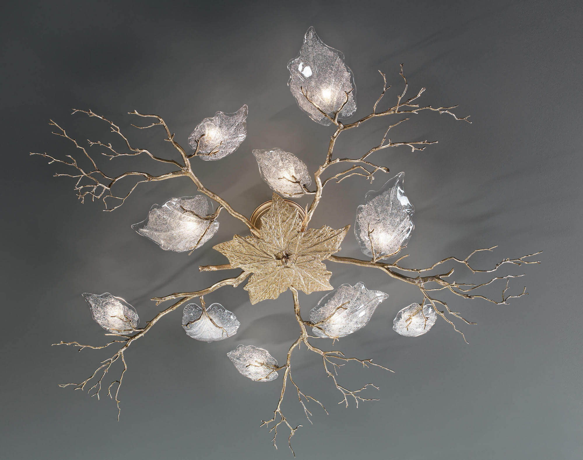 Designed with a random disposition of glass leaves that look like floating lights embraced by branches.
