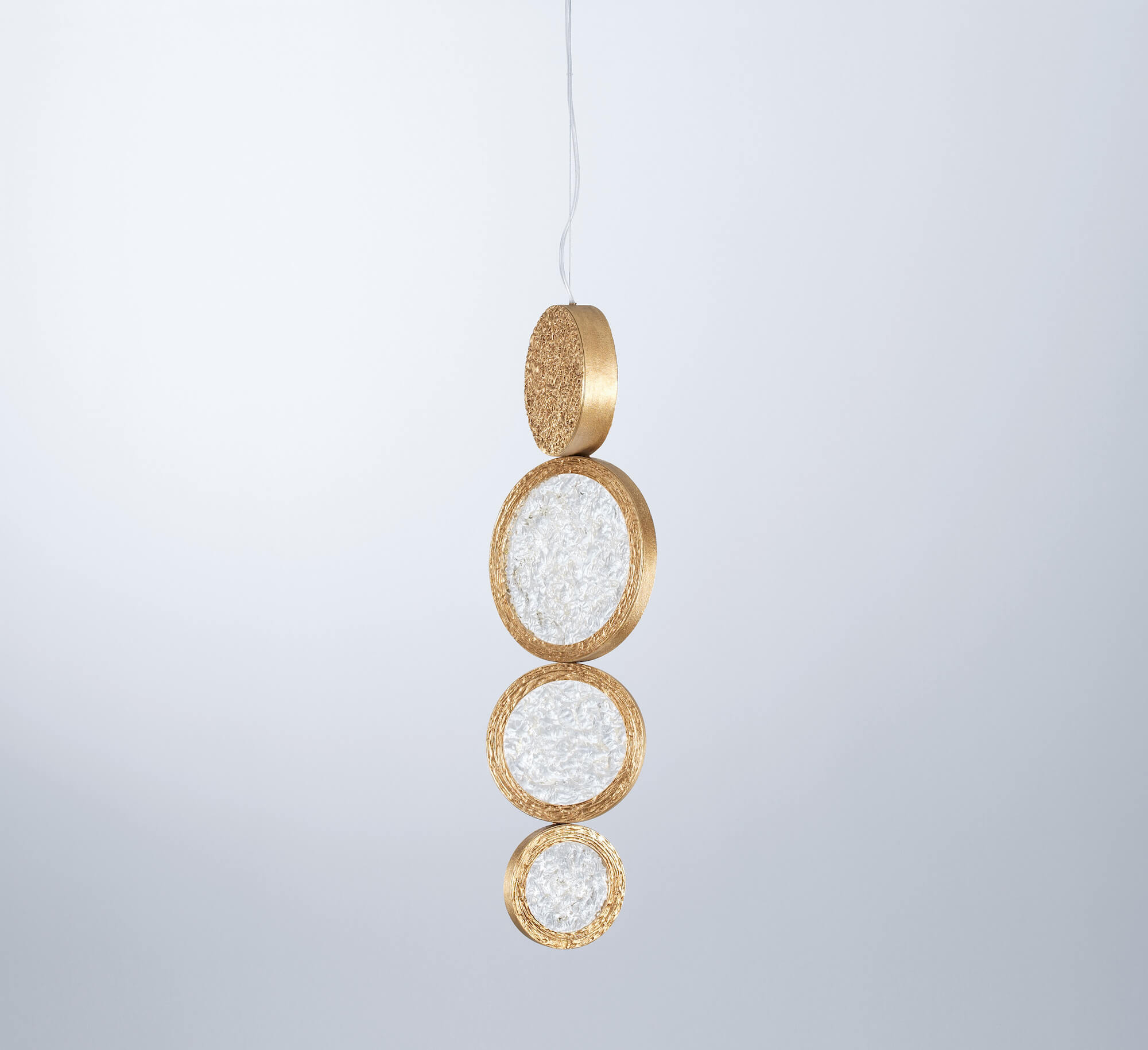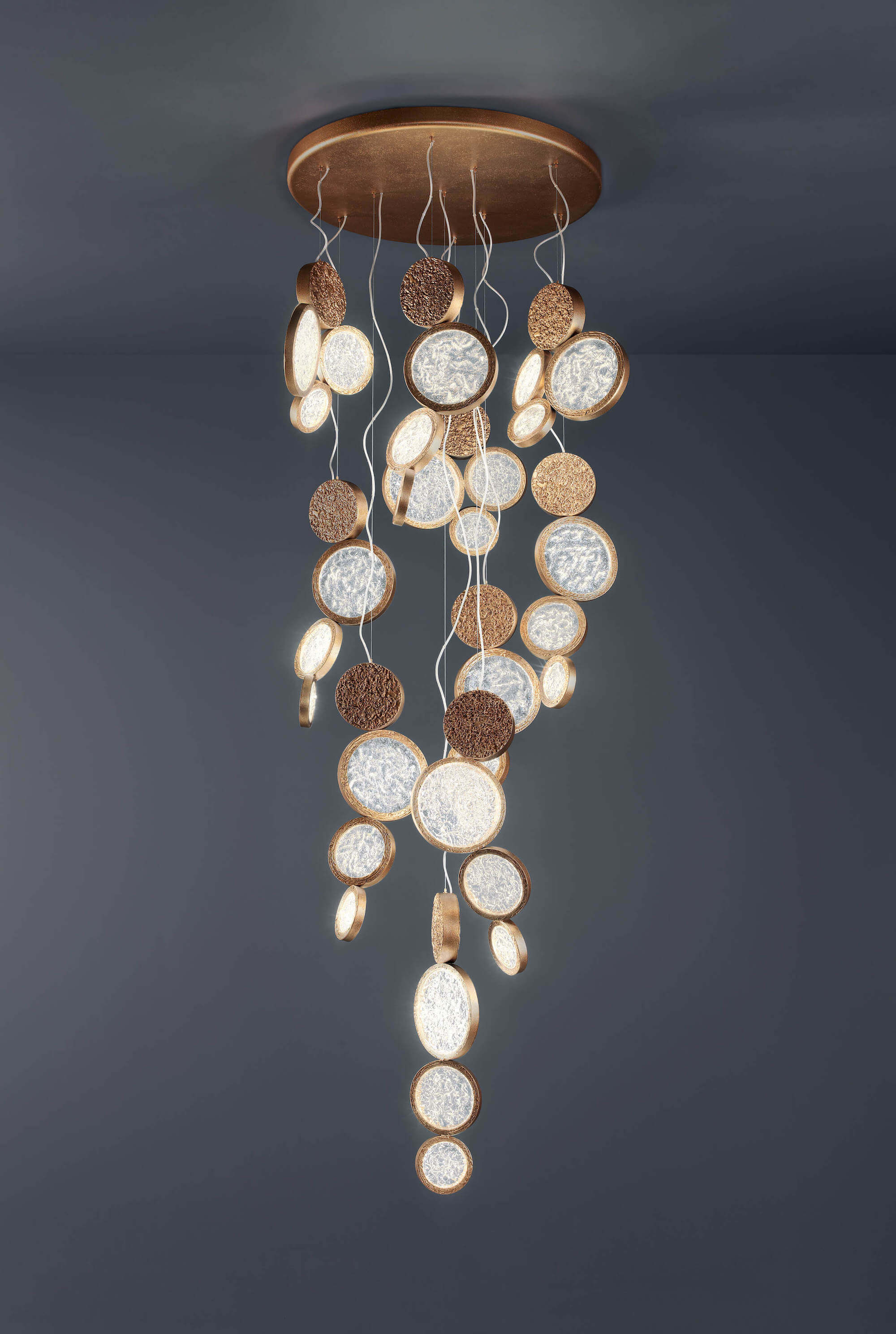 By the full moon contrasting light arises the Luna Collection, modern compositions with multiple rings of diffuse lighting. Designed under a mystical criteria of patterns, the circular pieces assume a position of high contrast and revolving texture, details that incorporate them as distinctive and eccentric, a bold choice in an interior design concept.