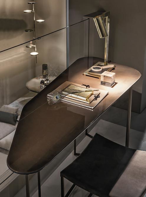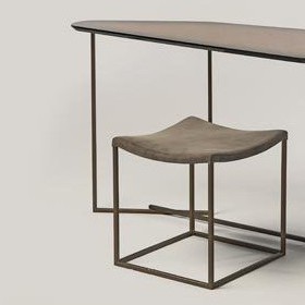 light bronze metal structure, wooden top in C80 resin lucida grigio sfumato seat in leather P20 nabuk liscio seppia