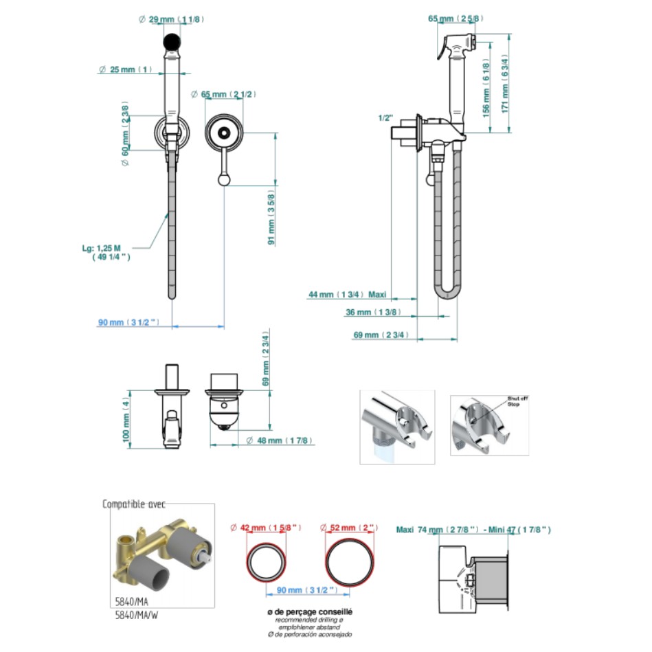 Trim only for WC douche including: trigger spray, wall mounted single lever mixer, reinforced hose (1.25m), wall outlet with integrated elbow with safety stopper