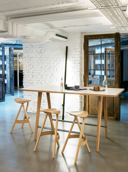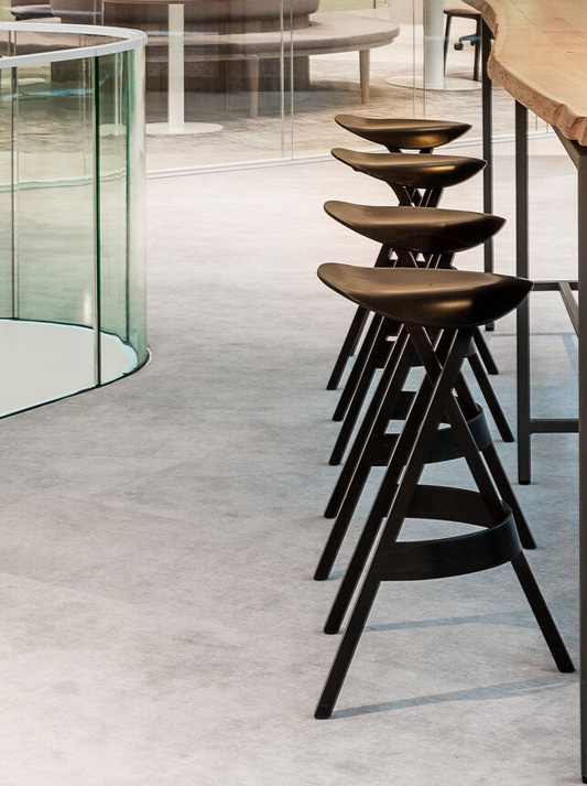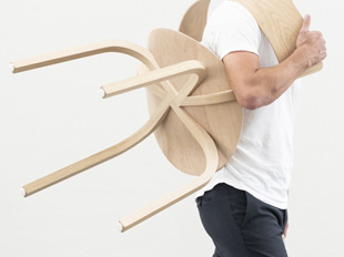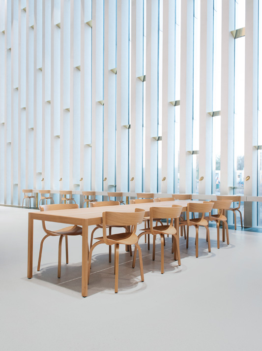 Stefan Diez has designed a wooden chair range that can be traced back to our bentwood heritage but has transformed it through the use of aesthetical and technological criteria. Bent chair legs and armrests merge in a "knot" and are embedded into the ergonomically shaped seat from underneath. With a suspenseful contrast between the elegantly curved wooden elements and the striking upholstery, the range communicates and also offers comfort: it does not prescribe a specific sitting posture, and the organically shaped backrest flexes for extra comfort.