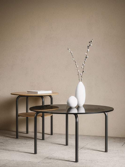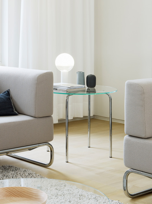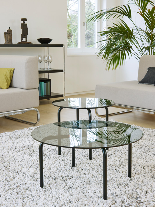 The rediscovery of a versatile classic: on the occasion of the 100 year Bauhaus anniversary, we have re-issued the round side table MR 515 by Ludwig Mies van der Rohe. The original version is available as a re-edition from the Thonet tubular steel furniture catalogue from 1935 with a tubular steel frame and glass tabletop. This table was presumably created around 1928 in the context of the Esters and Lange Houses in Krefeld designed by Mies van der Rohe. With a fresh look at the original, Studio Besau Marguerre designed more interpretations of the MR 515, resulting in adaptations that present sensitive embellishments to this furniture classic’s elegance. It combines modern ideas of use and technical details with a contemporary touch. Marcel Besau’s and Eva Marguerre’s perspective on the table series remains close to the original design, but the details make the difference. Their revisions to the design are both subtle and technical. The central crossing point of the table legs beneath the glass panel is especially elegant.