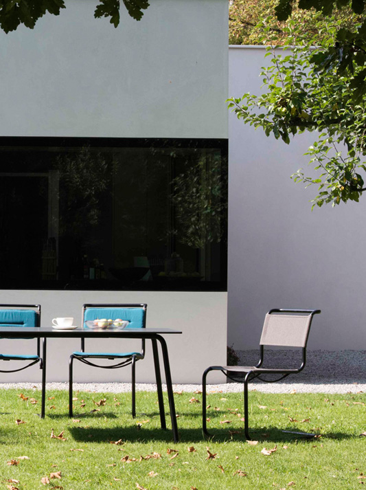 Cubic form, clear design, fine proportions, and flexing movement: The development of the perfected cantilever chairs S 33 and S 34, among the first of their kind, today combines zeitgeist and a sense of tradition. “Why four legs if two will suffice?”, wrote artist Kurt Schwitters in 1927 after seeing the first cantilever chairs in furniture history. The two chairs S 33 and S 34 caused a sensation at the Werkbund exhibit at the Weissenhof Estate in Stuttgart. Starting in 1925, Mart Stam experimented with small diameter gas pipes, and at first he connected them with standard pipe fittings as used by plumbers. As a further development, Stam created cantilevered chairs that no longer stood on four legs, and it was a construction principle that became an important building block in the history of modern furniture design with its formal restraint.