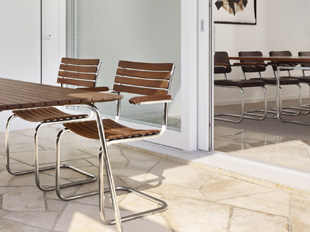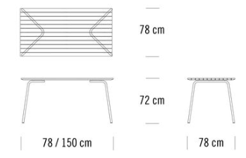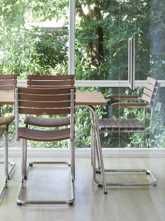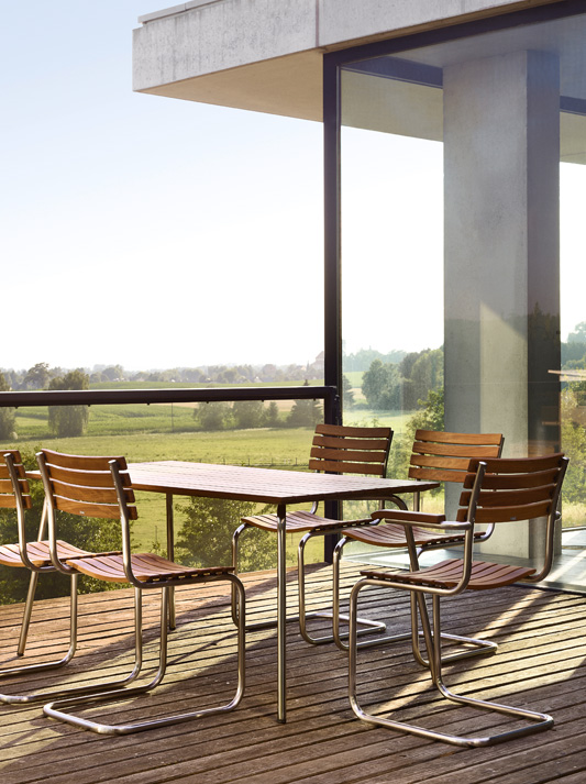 The classic patio table – beautiful, simple, and robust. The table and S 40 chairs form a harmonic combination for outdoor use. All materials are weather resistant. The wood laths are made of solid Iroko, a dense African wood that is highly weather resistant (FSC seal). It looks like teak and has a smooth, even surface. We oil the laths for protection.