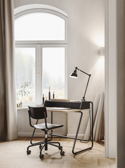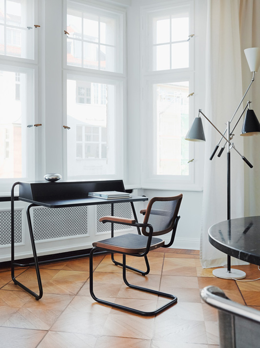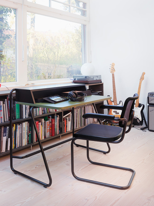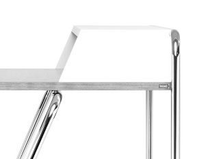 In various versions and with optional accessories, the graceful desk S 1200 becomes a personalized piece of furniture and makes working an experience. For this design, the Thonet Design Team took inspiration from the company’s collection of classic tubular steel furniture. The decisive advantage of the S 1200 is its compact dimensions, which allow it to be integrated into even the smallest living spaces. A well-conceived tubular steel frame forms the basis of the S 1200; its slanted design makes it easy to stand up even in the narrowest of hallways and niches. A footrest assures a comfortable seating position. To keep things on and in the desk properly organized, there are a variety of optional accessories made of flocked metal: S 1211 pencil box, S 1212 filing box DIN A4, S 1213 multi-functional bookrest, S 1214 cable management.