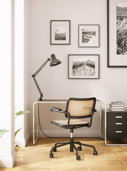 It is as though Marcel Breuer had anticipated today’s home offices and mobile computers: The compact tubular steel desk S 285 that he designed is an elegant companion for modern lifestyle and work. Marcel Breuer’s tubular steel desk S 285 for Thonet is a successful example of the programmatic Bauhaus claim to combine art and technology into a new entity. Breuer was a trained joiner and he combined his knowledge of tubular steel as a material with his experience in interior design. The tabletop and storage elements made of varnished or stained wood harmoniously fit into the tubular steel frame. The supporting frame consists of a curved line, and the wooden elements characterised by clear forms seem to float in it. This piece of furniture with its formally balanced proportions represents an important piece of contemporary history, known as “The New Objectivity”. Thonet produces various versions of this striking model.