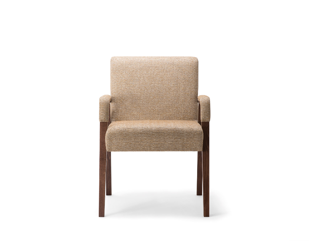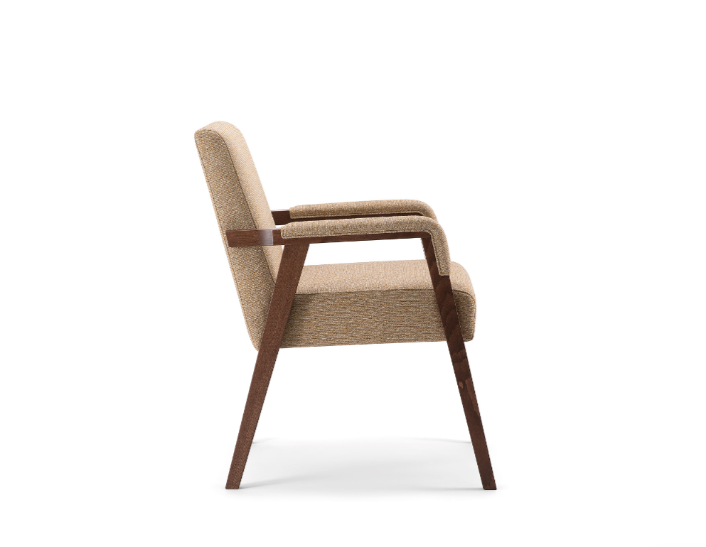 Seduta sorprendentemente accogliente, che riporta agli anni'70 in termini diforme e tessuti ma con un tocco di modernita. Poltroncina versatile efunzionale, realizzata in faggio, ottimale per arredi contract e navale.