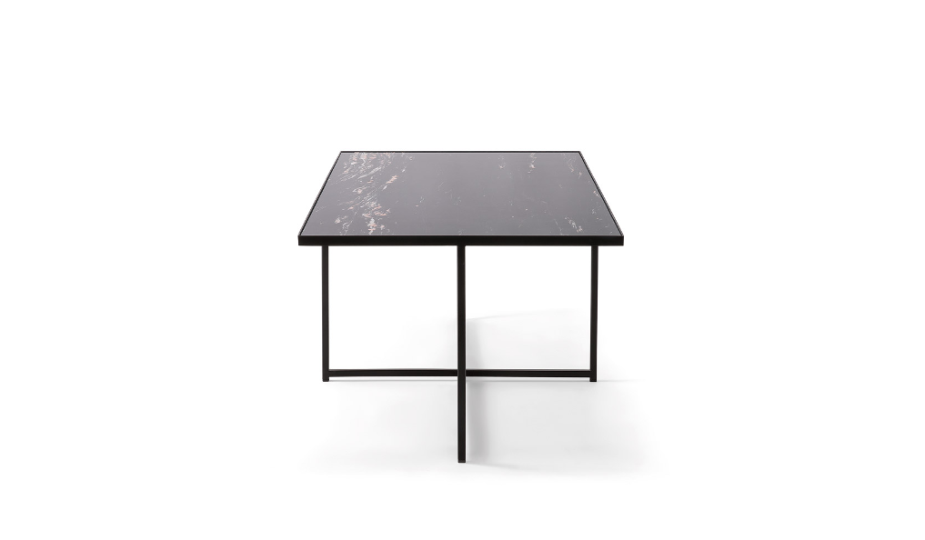 Collezione di tavoli in metallo, abbinati a piani in legno o marmo.