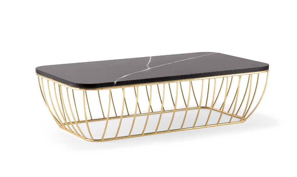 Collezione di tavoli in metallo, abbinati a piani in legno marmo o imbottiti.
