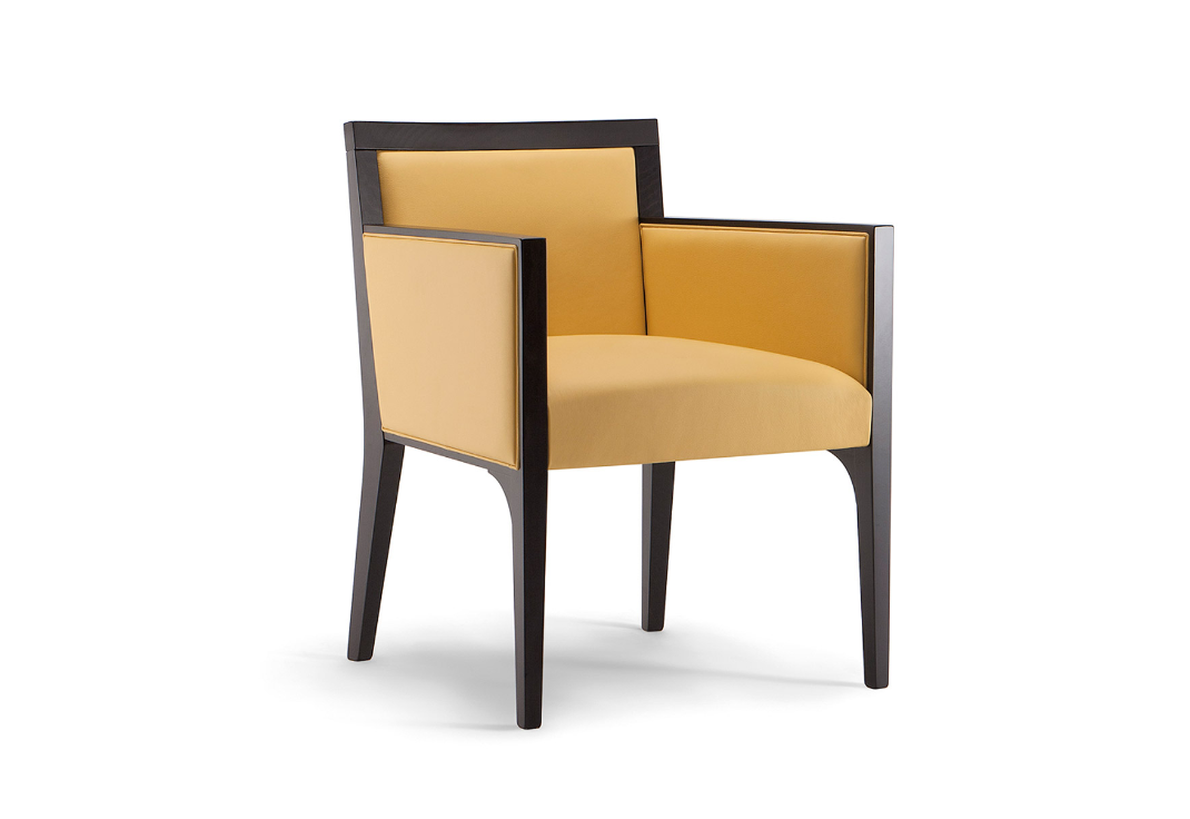 Memorie del 900 e rigore formale contemporaneo, convivono piacevolmentein un'ideale armonia fra il legno, il tessuto e il metallo.La poltrona Ginevra rappresenta un'ottima soluzione per arredare coneleganza ristoranti e hotel. La cornice in legno massello, cosi come le gambe,racchiudono un sedile e uno schienale sapientemente imbottiti.Le diverse tinte del legno, abbinabili a raffinati tessuti, offrono la possibilitadi personalizzare i prodotti e creare match perfetti per ogni spazio.