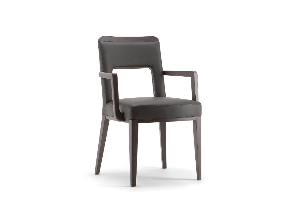 L'ampia apertura sullo schienale caratterizza l’estetica di questa seduta e la