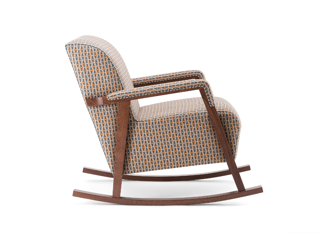 Seduta sorprendentemente accogliente, che riporta agli anni'70 in termini diforme e tessuti ma con un tocco di modernita. Poltrona a dondolo versatile efunzionale, realizzata in faggio, ottimale per arredi contract e navale.