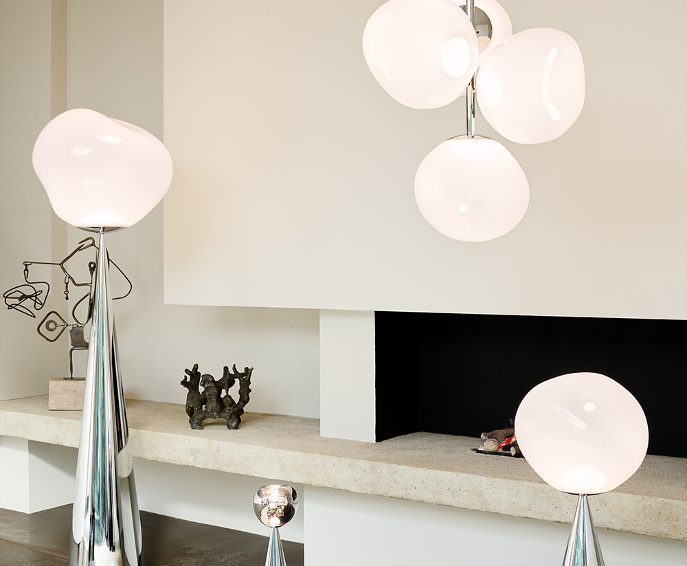 Obsessed with the idea of creating an imperfect, organic and naturalistic lighting object, Melt was created in collaboration with FRONT – a Swedish design collective. Melt is evocative of molten glass, the interior of a melting glacier, or images of deep space.