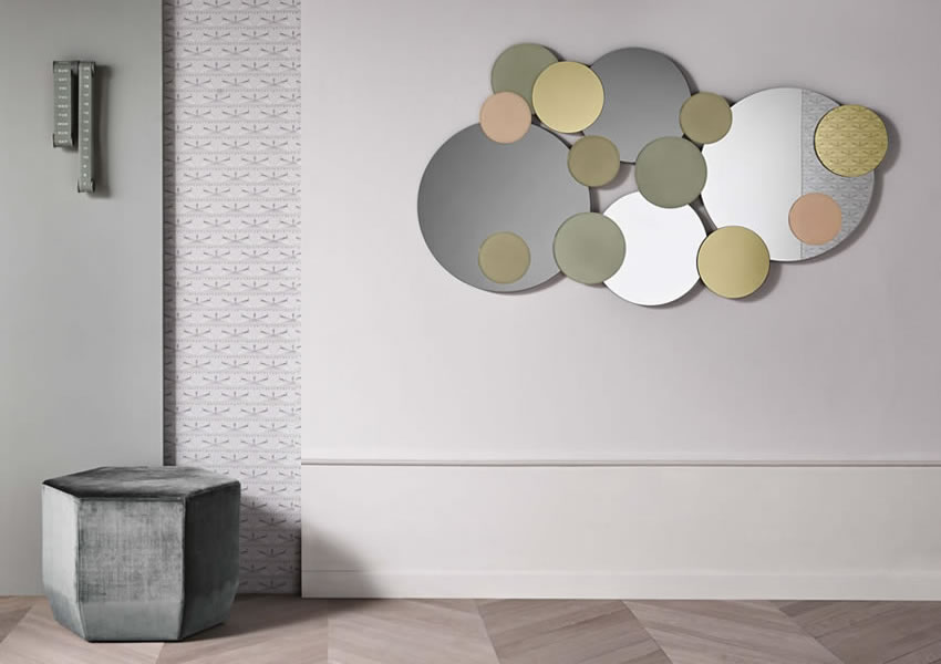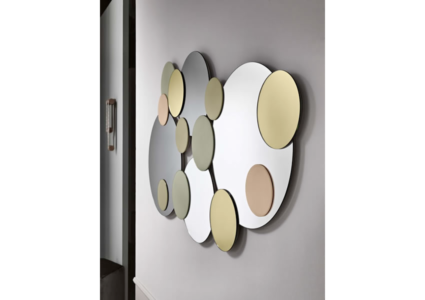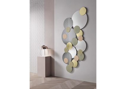 Wall mirror made of round elements in several dimensions in smoked, bronze, gold, pink and grey colour.
