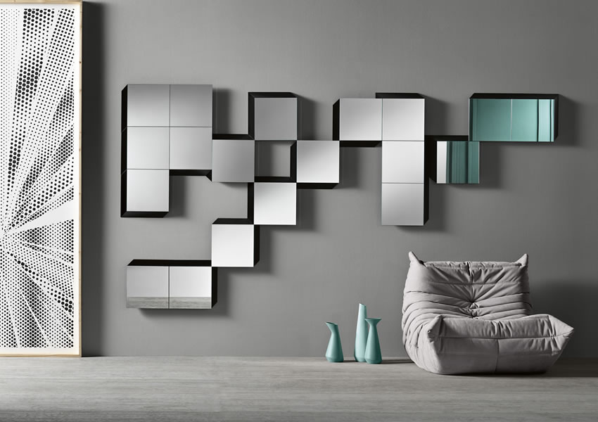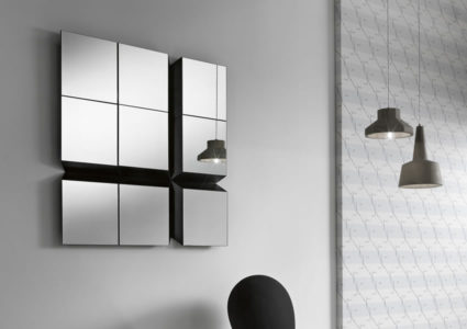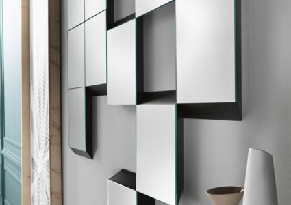 The design’s main character is the frame, made of a black wooden back panel surrounding the reflecting elements and giving the entire parallelepiped composition a three-dimensional impression.