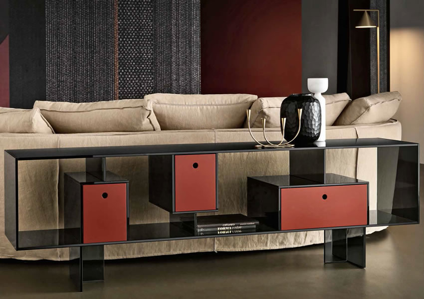 Liber M sideboard is suitable for various use. Available in extra clear, transparent or smoked glass, with drawers in canaletto walnut, testa di moro leather, matt white or RAL lacquered.