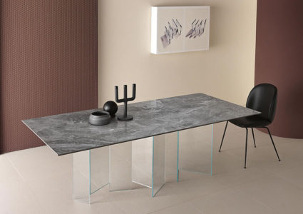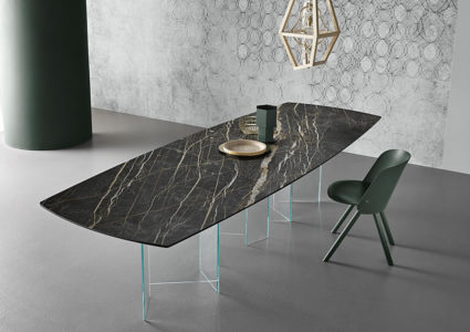 The table tops placed on the bases are in the 3 new polished finishes in ceramic+glass with marble effect.