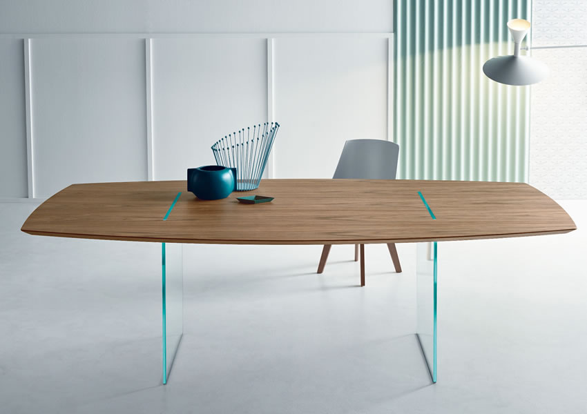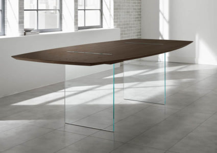 Magically suspended the top in canaletto walnut or wengé, sustained and crossed by two vertical glass panels.