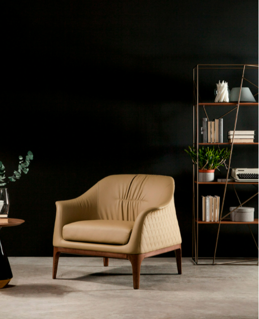 Una poltrona o un divano che si ispira ad un lusso morbido e delicato: il legno di frassino, in finitura noce Canaletto, rovere scuro, o rovere naturale, si abbina lieve al rivestimento in pelle ed eco-pelle, in tutte le colorazioni disponibili.