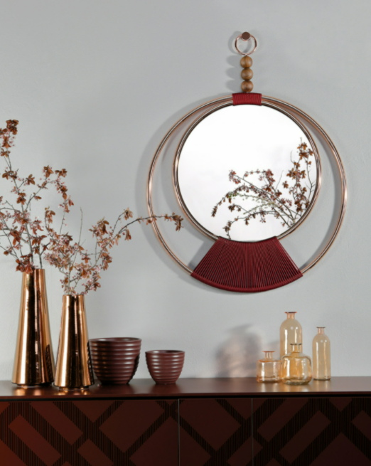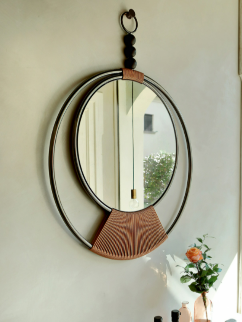 Un delicato intreccio in tessuto, sapientemente lavorato a mano, sostiene uno specchio dalle finiture bronzate o grey. Una struttura in metallo cromato, un cerchio protettivo per lo specchio, forma una figura leggera e presente, che si completa con tre particolari in legno massello. Un pendente per rendere indimenticabile ogni parete.