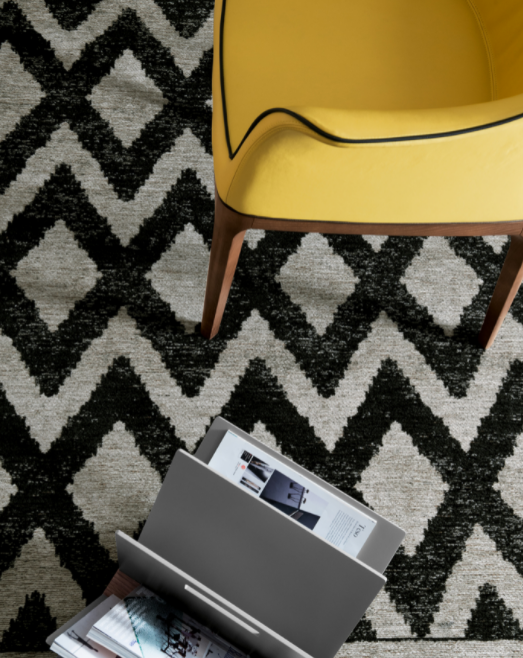Giotto è un tappeto a filato industriale, con una fantasia a rombi di colore bianco e nero, e impreziosito da frange