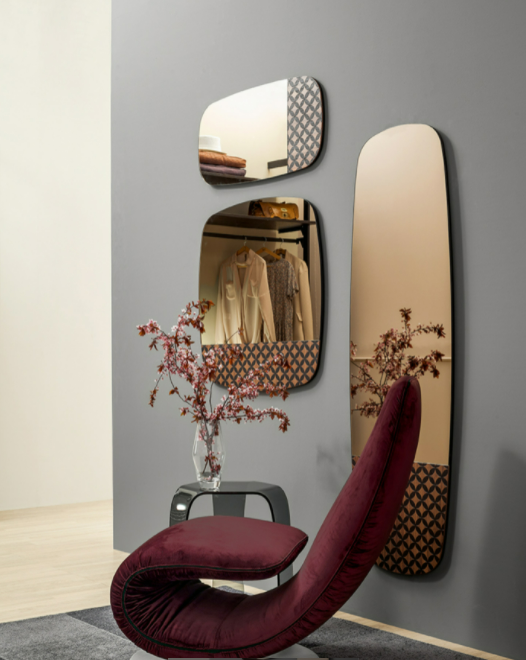 Un taglio particolare ed una forma unica che si spezza per dare spazio, oltre allo specchio, anche alla fantasia della struttura. Il legno ne risulta esaltato ed arricchito ad un tempo, e l'accoppiata con specchi argentati o bronzei rende Marguerite un pezzo unico.