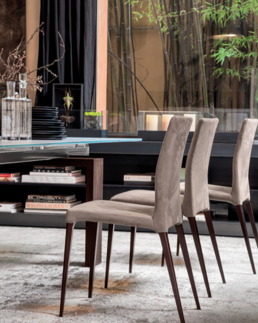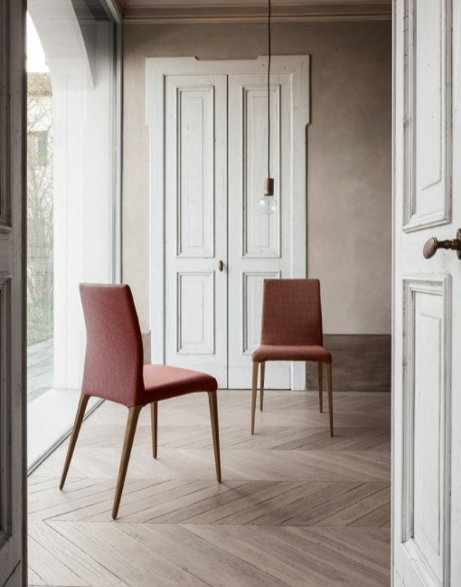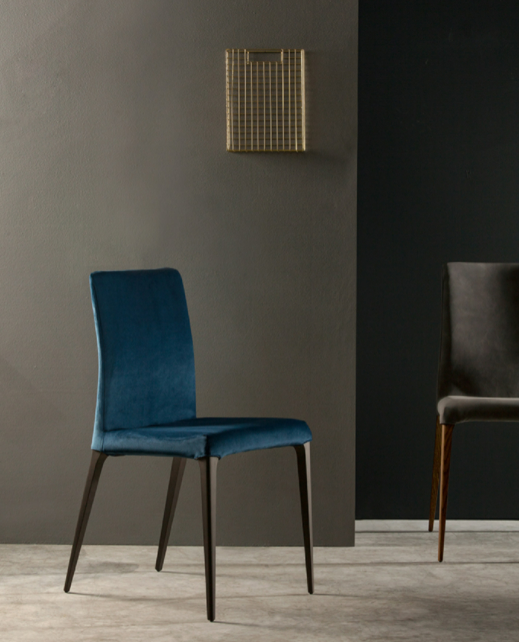 Sedia con una struttura in legno frassino tinto noce, rovere scuro termotrattato e rovere naturale. I diversi rivestimenti, in pelle, pelle fiore, pelle nabuk, eco-pelle e diversi tipi di tessuto permettono di accostare questa sedia a diversi tipi di tavolo, per un effetto contemporaneo ed intramontabile ad un tempo.