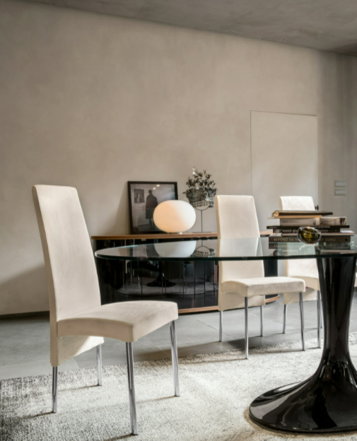 Sedia con struttura in metallo cromato, su cui poggia la seduta creata con uno stampo di poliuretano. La forza del materiale si unisce alla verticalità di Charonne, che denota eleganza e carattere.