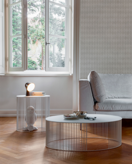 Andra si compone di linee verticali, una cintura circolare in filo di metallo verniciato, bianco per brillare più luminoso, nero per l’eleganza. Il metallo si unisce al vetro del piano, temperato ed acidato, anch'esso disponibile sia in bianco che in nero.