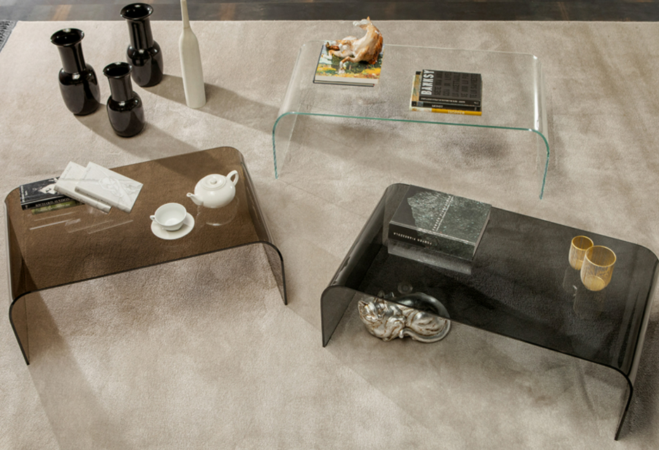 Tavolino dalla linea sinuosa e minimal, in finitura extrachiaro, bronzo o fumè. Disponibile in tre misure.