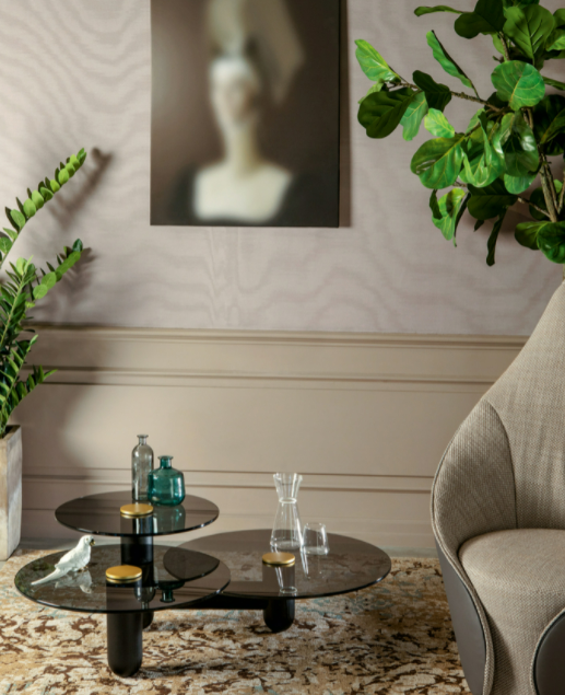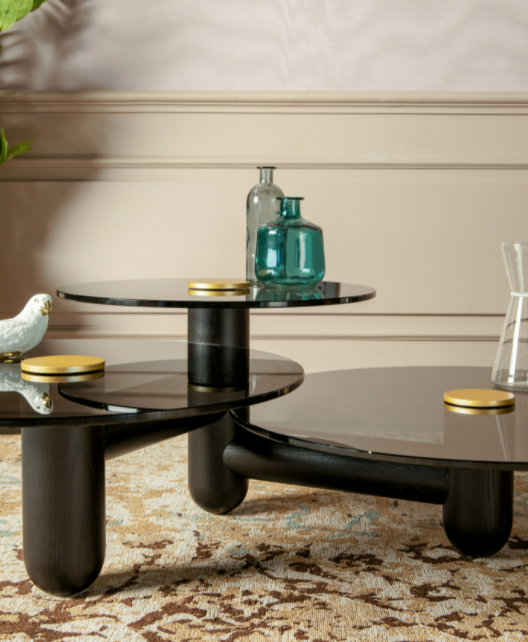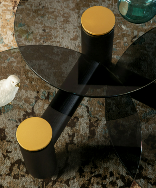 L’eleganza e l’armonia delle forme pure caratterizzano il tavolino Cosmo, composto da tre top in vetro con bottone centrale in oro satinato e base in legno massello. Le diverse altezze dei tre piani ne esaltano l’estetica potente.