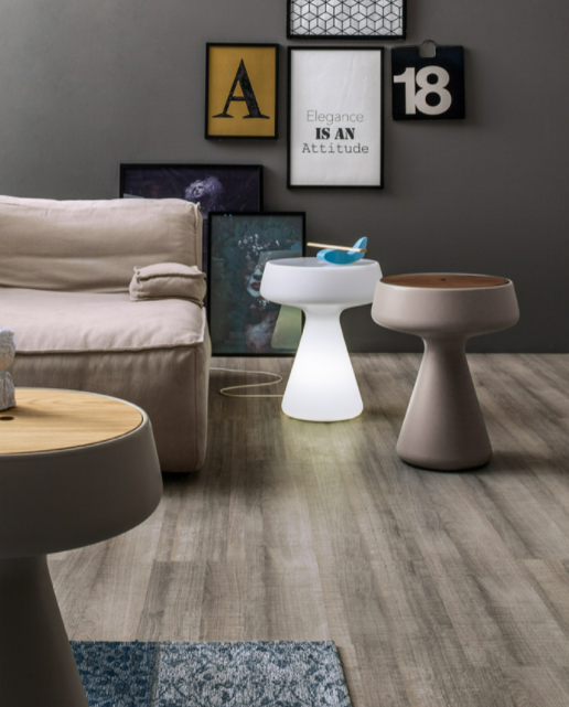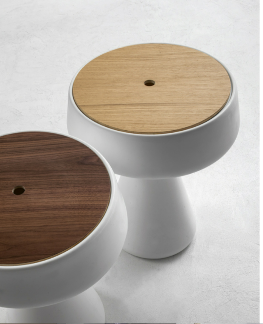 Un servetto dalla forma particolare, che si apre compatto verso l'alto, nel punto in cui il polietilene della struttura si unisce al legno del top.