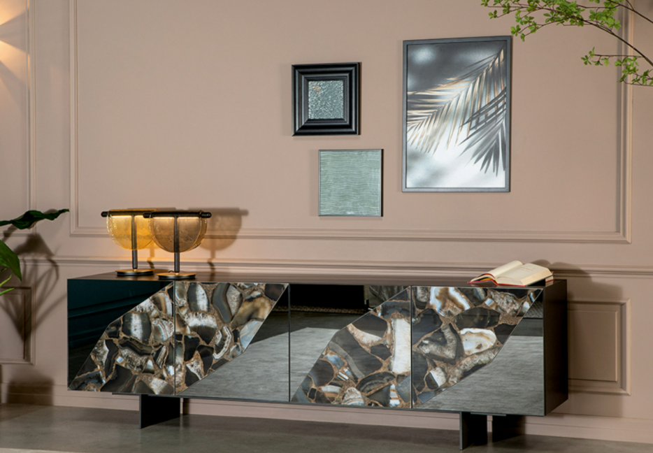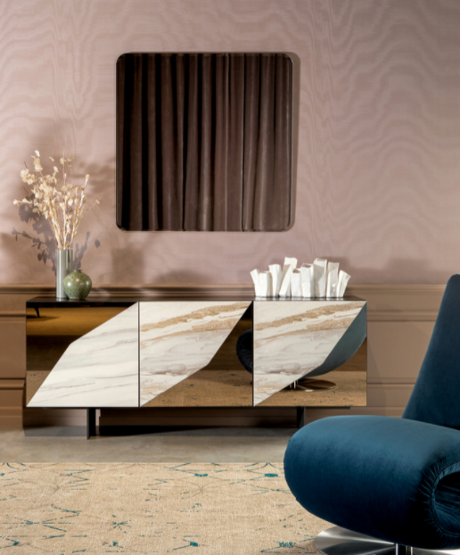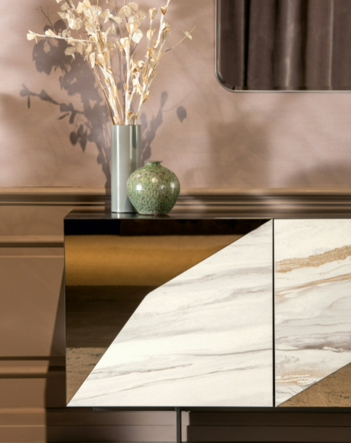 La purezza del design incontra la preziosa lavorazione artigianale nella raffinata madia Alcione, caratterizzata dall’elegante combinazione di porcellana e vetro sulle ante. La manifattura esclusiva e la fusione dei diversi materiali crea una continua variazione di luminosità, dall’estetica potente.