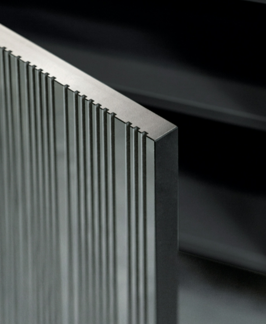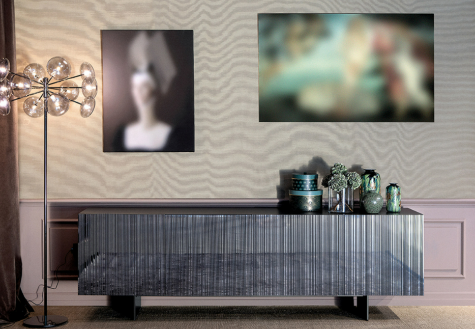 Barcode: dal suo nome deriva un’originale madia che accosta un insieme di elementi lineari a costrasto, tramite un gioco di specchio argento e laccatura nera o nella variante bianca con laccatura nera.