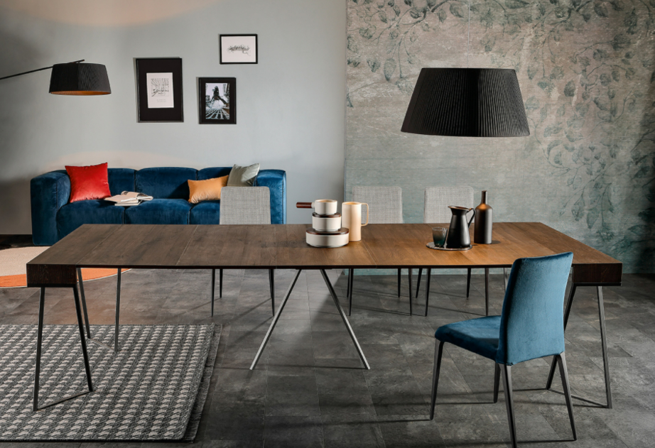 Un incrocio di fili metallici crea la base di Beverly, consolle che si caratterizza per il suo design geometrico e aperto. Il piano in legno, disponibile in finitura noce Canaletto o rovere, si può allungare a piacere, grazie al binario in alluminio, e rende questa consolle perfetta per essere utilizzata in ogni ambiente, conservando spazio e mantenendo una funzionalità unica.