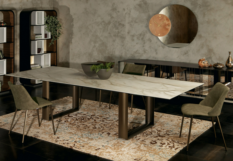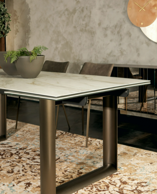 La particolare sagomatura delle basi rende il tavolo raffinato, adattabile ad ogni progetto o ambiente, grazie anche alle molteplici finiture.