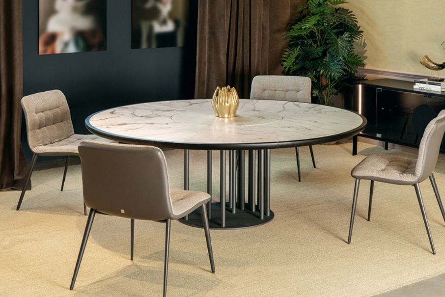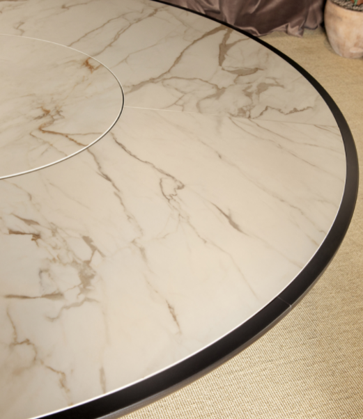 Tavolo caratterizzato da un’originale struttura con base a gabbia, composta da linee verticali in acciaio verniciato, con piano rotondo in legno massello e porcellana con Lazy Susan incorportato a filo.