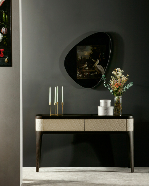 Tiffany è una consolle ispirata ad un lusso morbido e delicato: il legno di frassino, in finitura noce Canaletto, rovere scuro, o rovere naturale, si abbina lieve al rivestimento in pelle ed eco-pelle, in tutte le colorazioni disponibili.
