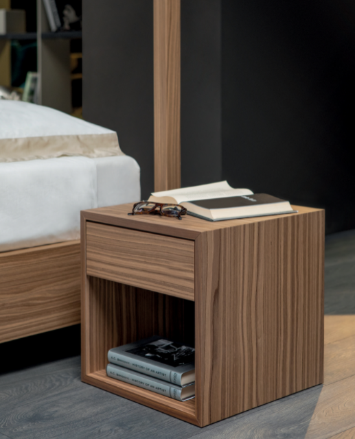 Comodino con cassetto, struttura in noce canaletto, rovere scuro o frassino nero. Cubò, oltre che elemento d’arredo da terra, può anche essere sospeso e applicato alla parete.