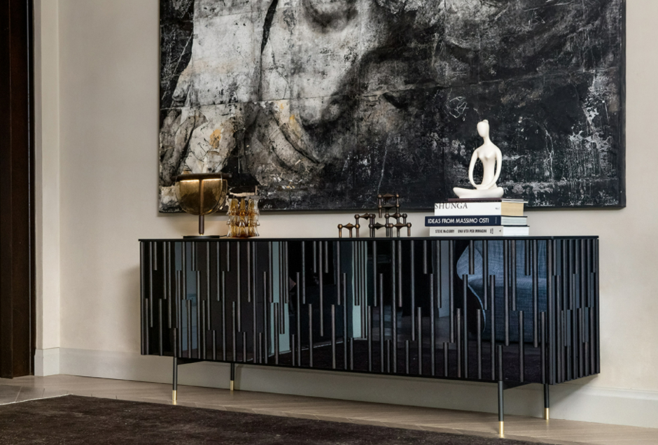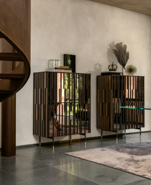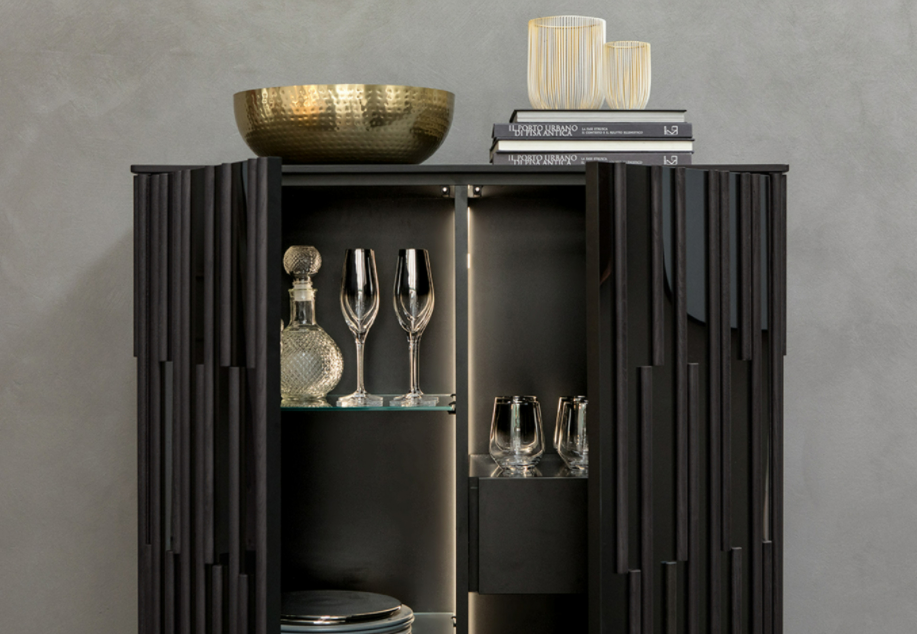 Un programma giorno ed un programma notte completo ed estremamente elegante. Gocce in legno massello applicate con estrema cura alle ante effetto specchio. Un top sagomato e stondato fine e sofisticato; una struttura in metallo con inserti in finitura oro. tutto ciò per non lasciare nulla al caso.