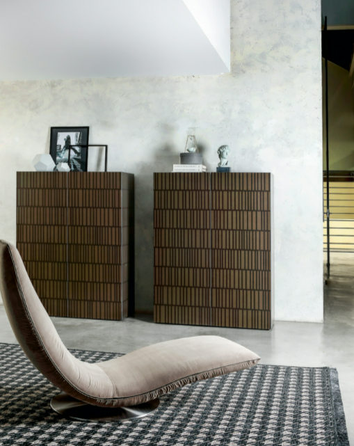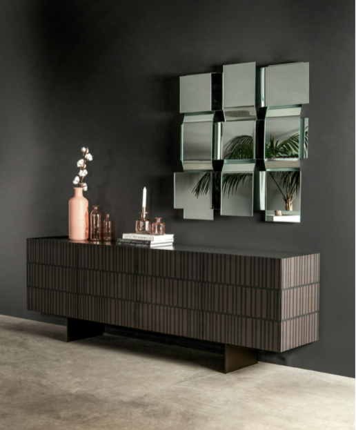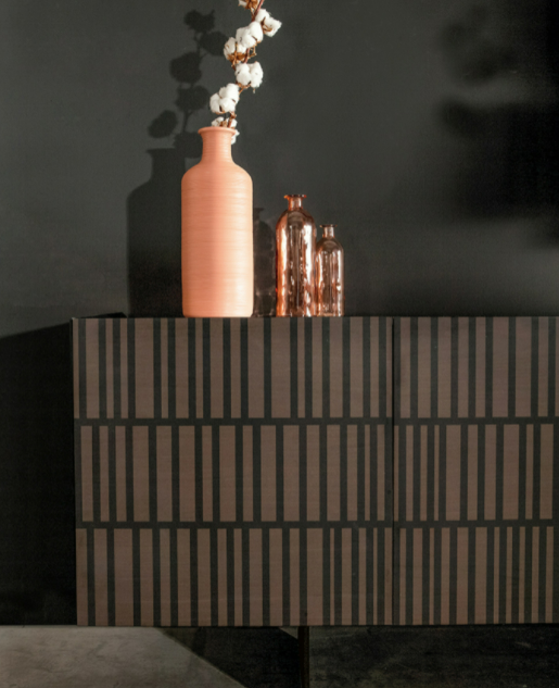 La serigrafia di Flamingo è semplice ed efficace: linee verticali discontinue, a rilevare e definire le ante di cui si compone. Toni scuri, eleganti, che si definiscono in un box contenitore a due ante, o in madie da tre o quattro ante, che